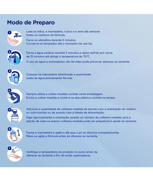 Preparação segura: Utilize água fervida e resfriada até 70°C, misture a fórmula com a colher-medida nivelada e agite bem até dissolver totalmente.