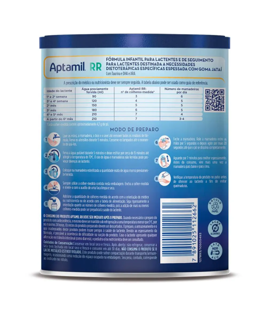 Aptamil RR 800g é uma fórmula infantil indicada para bebês de 0 a 12 meses com necessidades dietoterápicas específicas. Espessada com goma jataí, contém DHA, ARA e taurina.