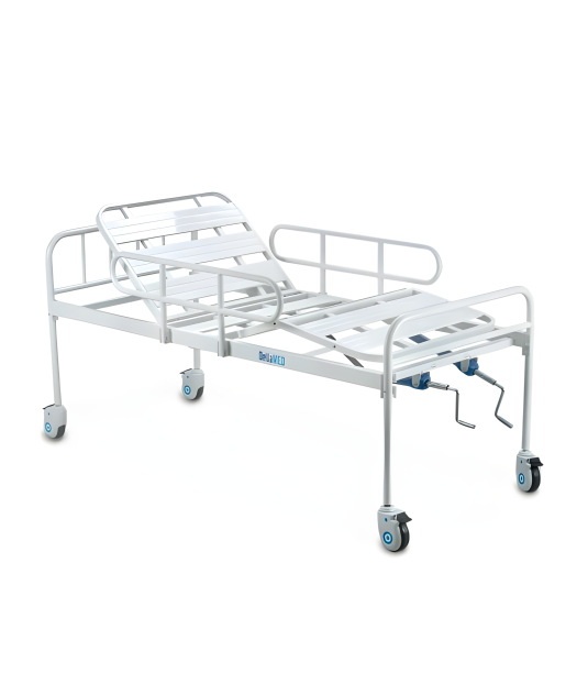 Leito hospitalar manual com estrutura reforçada e duas manivelas, que permite ajustes precisos e silenciosos da cabeceira e do apoio de pernas, garantindo conforto ao paciente.