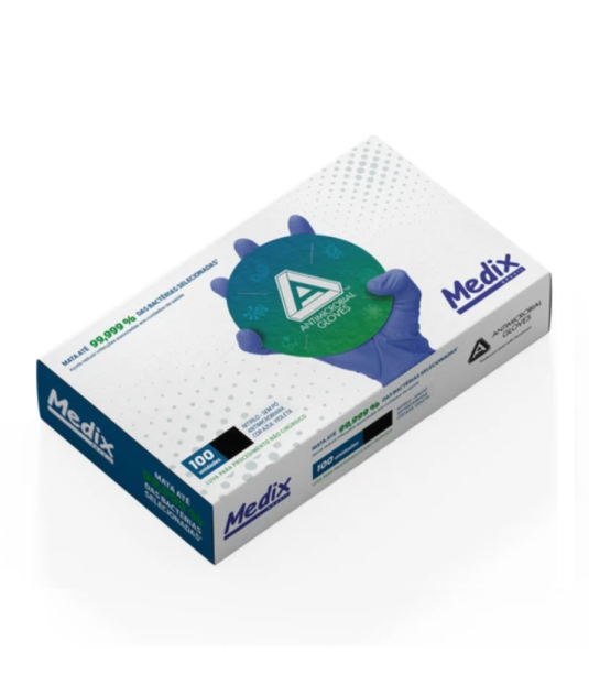 Fabricada com corante fotossensibilizador com ação antimicrobiana; Levemente texturizada nas pontas dos dedos; Possui eficiência bactericida e virucida; Descartável e de uso único; Ambidestra; Não estéril; Sem pó. Material: borracha sintética (nitrilo) Cor: azul violeta Tamanhos: P / M / G Validade: 3 anos após a data de fabricação Embalagem: caixa com 100 unidades Dimensões embalagem: 12,5cm(c) x 24,5cm(l) x 4,1cm(a) Peso embalagem: PP(320g), P(350g), M(350g), G(390g)