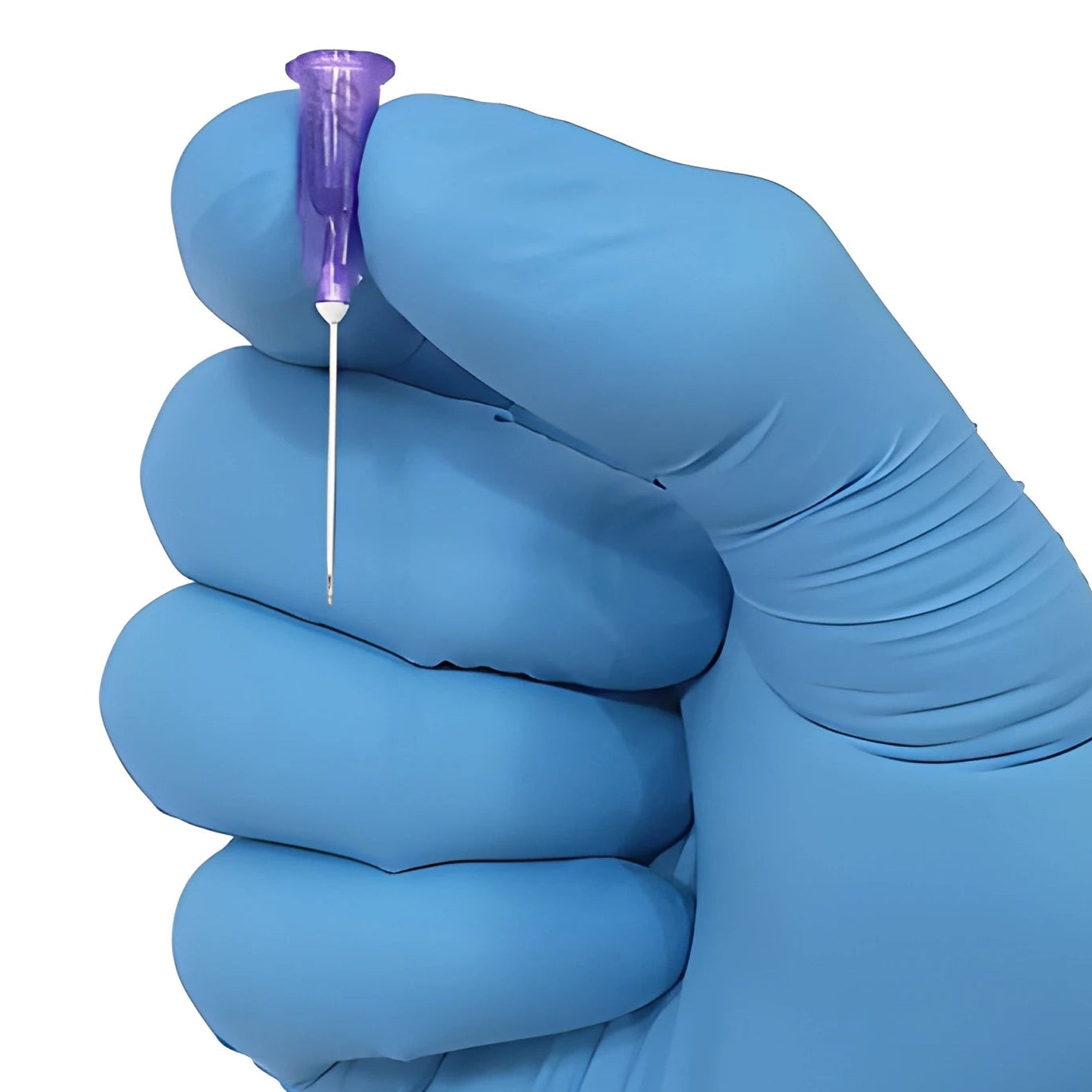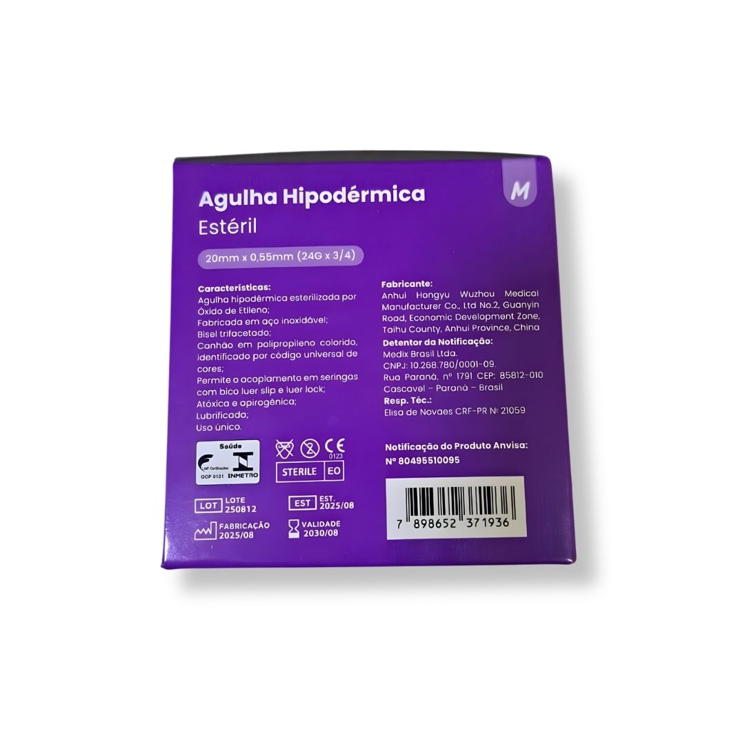 Agulhas estéreis (EO) com bisel trifacetado, lubrificadas com silicone e compatíveis com Luer Slip e Luer Lock. Tamanho 20 mm × 0,55 mm (calibre 24G, canhão roxo). Embalagem econômica com 100 unidades.