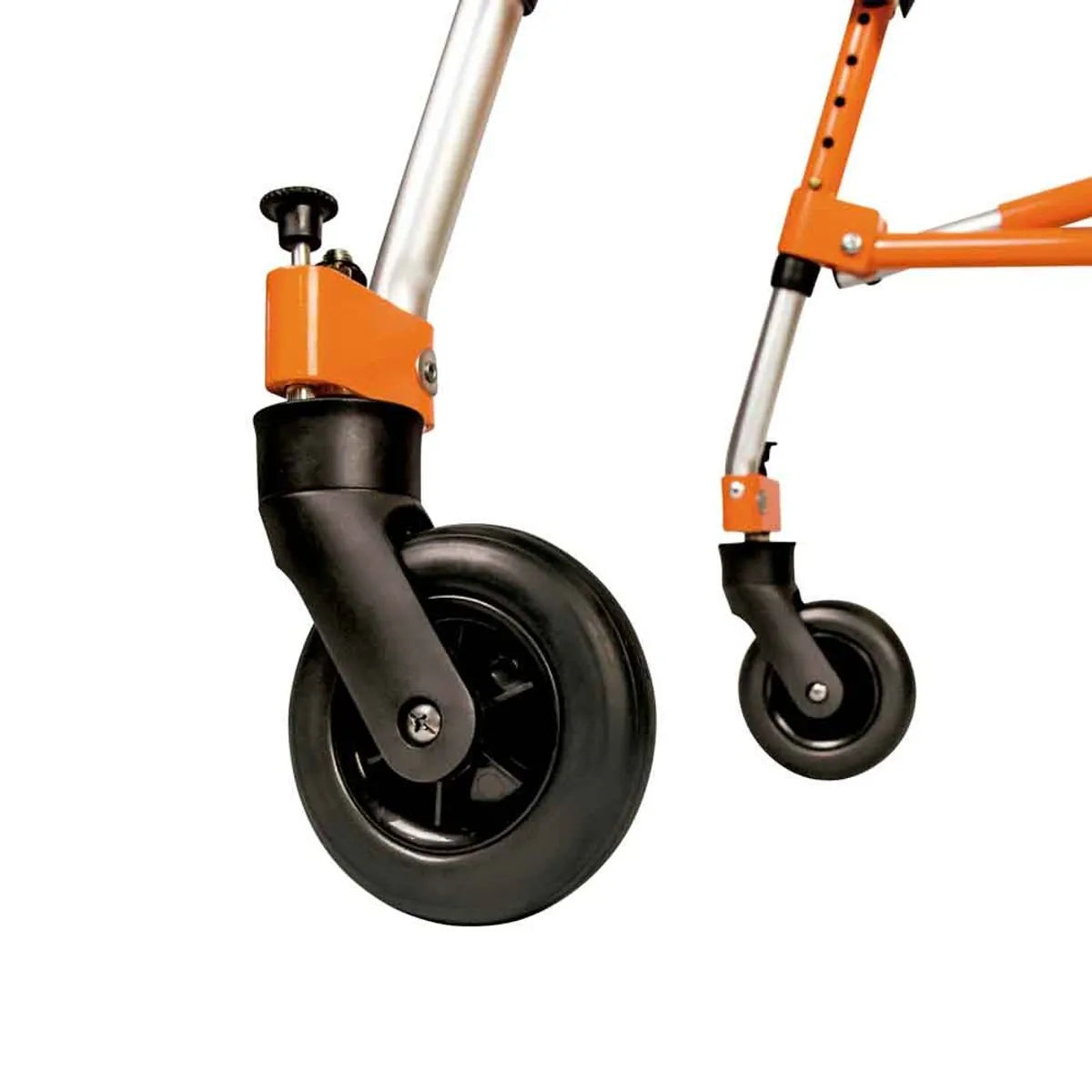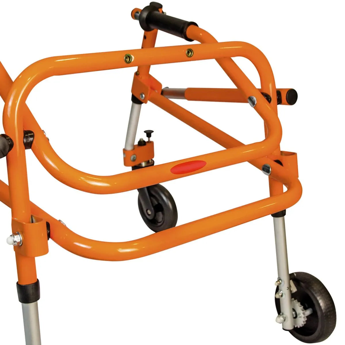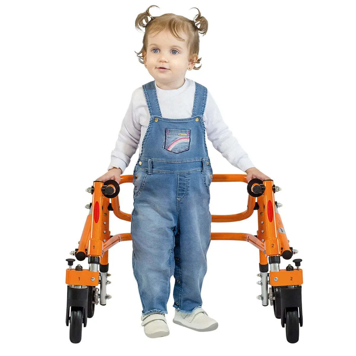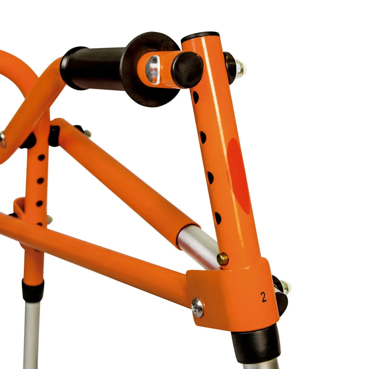 Auxilia na locomoção e reabilitação com postura ereta, estrutura em alumínio, altura ajustável e rodas traseiras com sistema antirrecuo. Leve, dobrável e fácil de transportar.