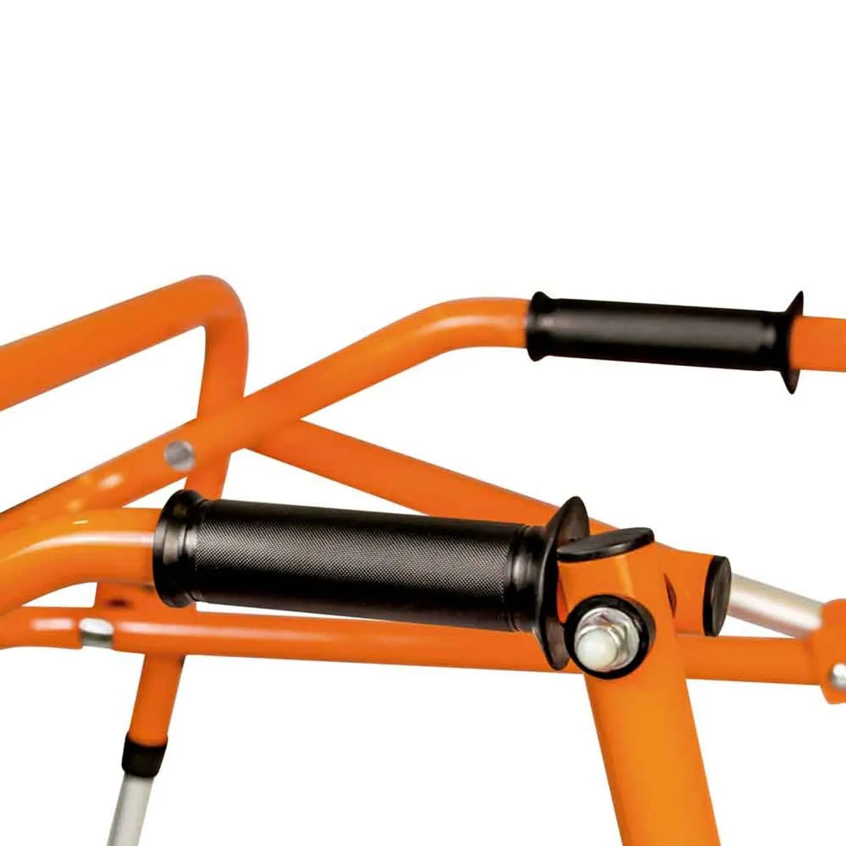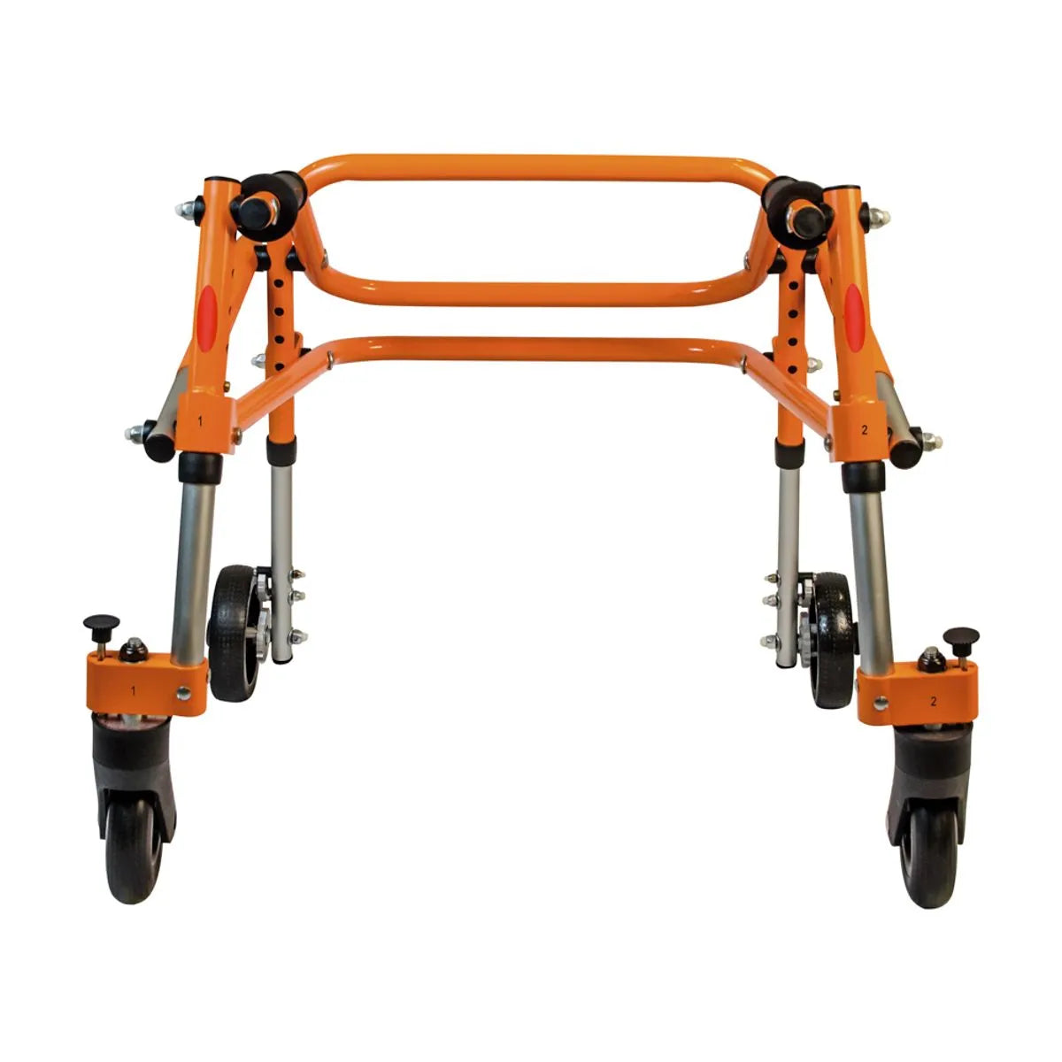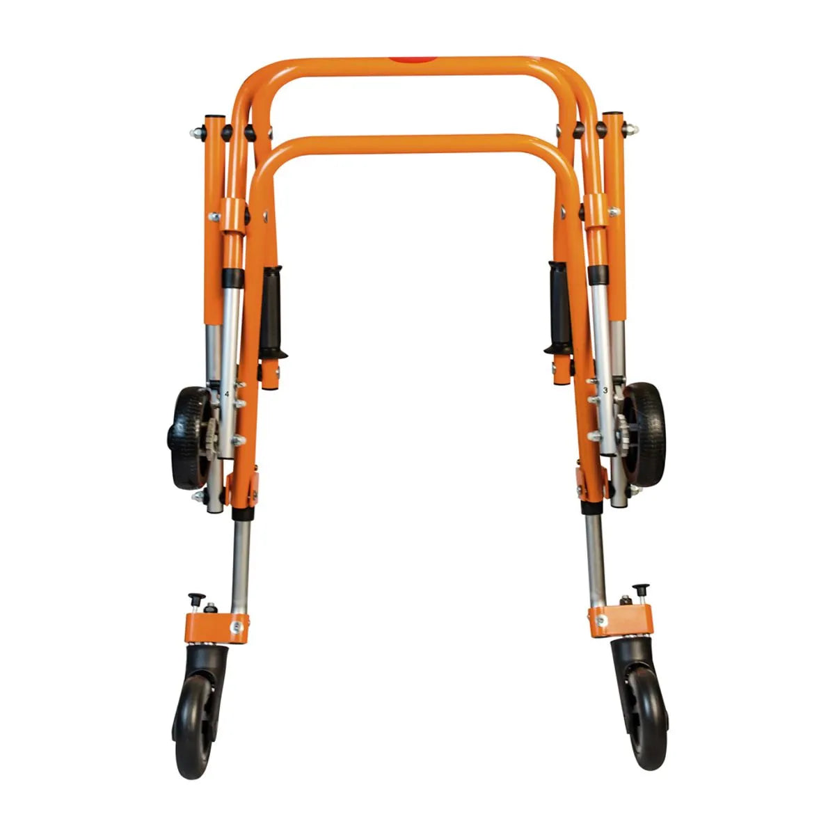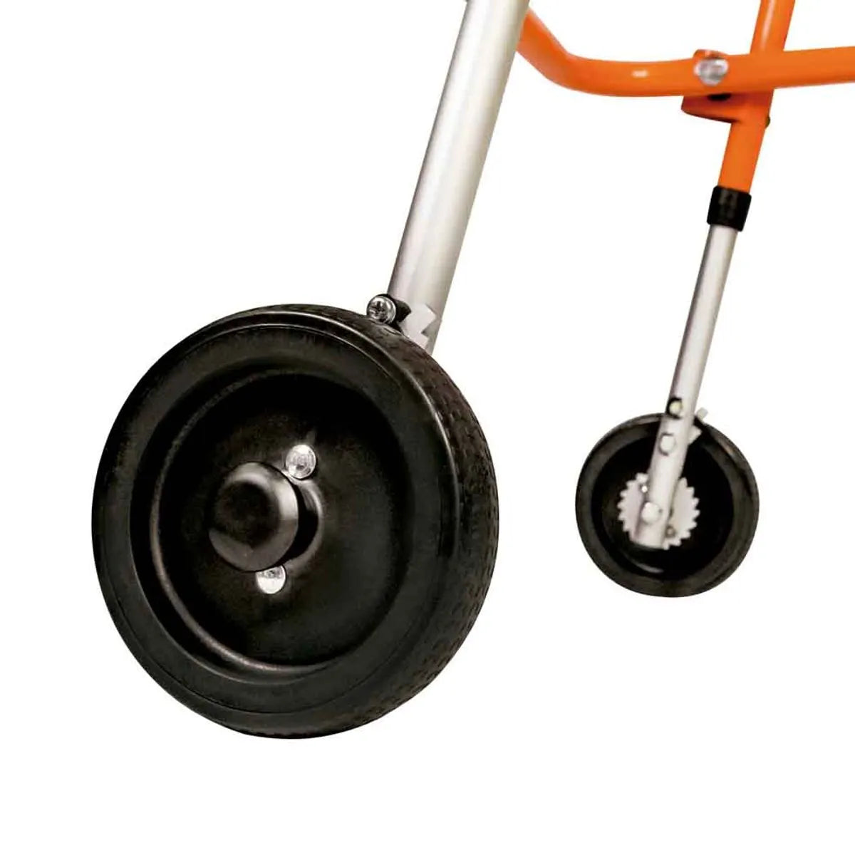 Auxilia na locomoção e reabilitação com postura ereta, estrutura em alumínio, altura ajustável e rodas traseiras com sistema antirrecuo. Leve, dobrável e fácil de transportar.