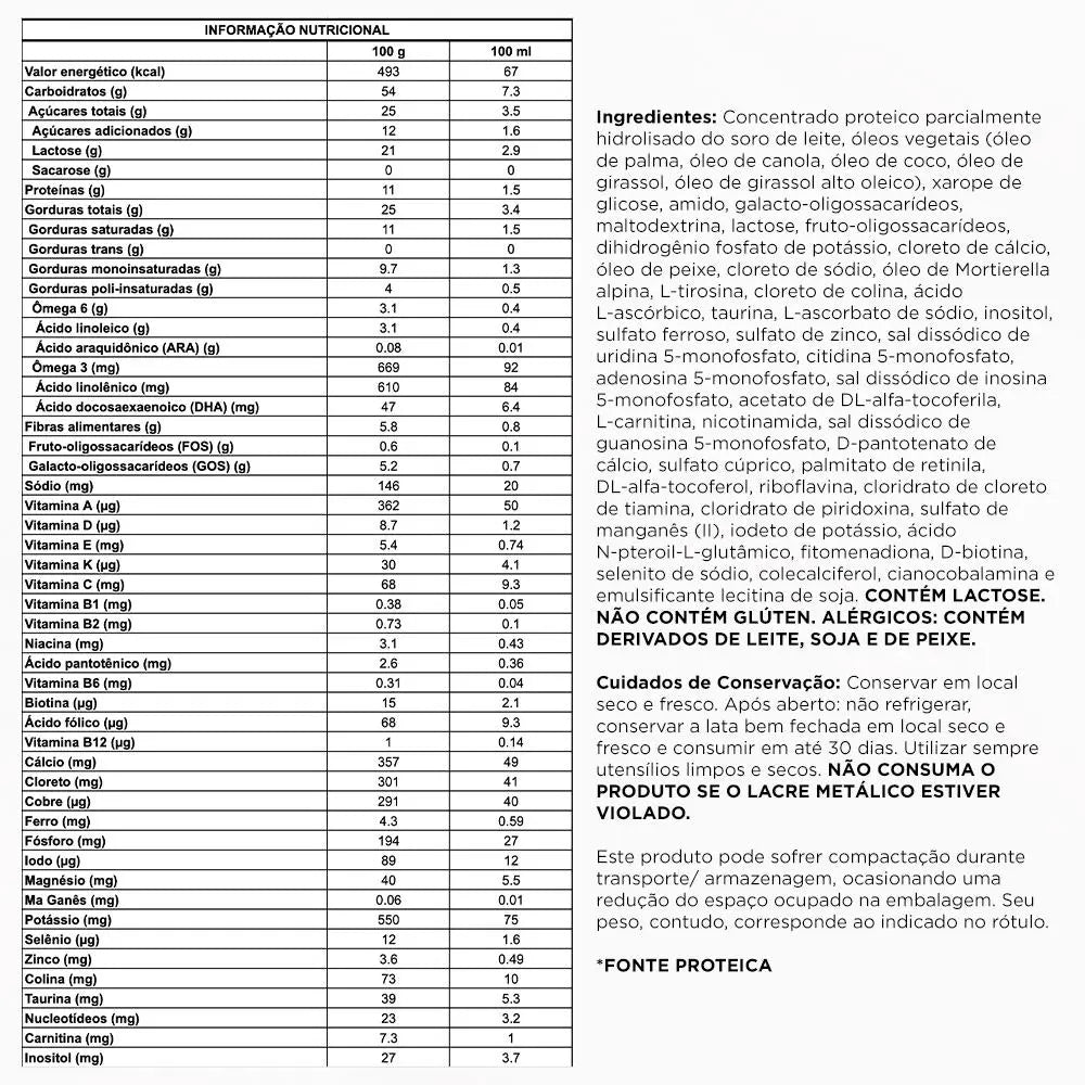 Rico em DHA e ARA para suporte ao desenvolvimento cerebral e visual.