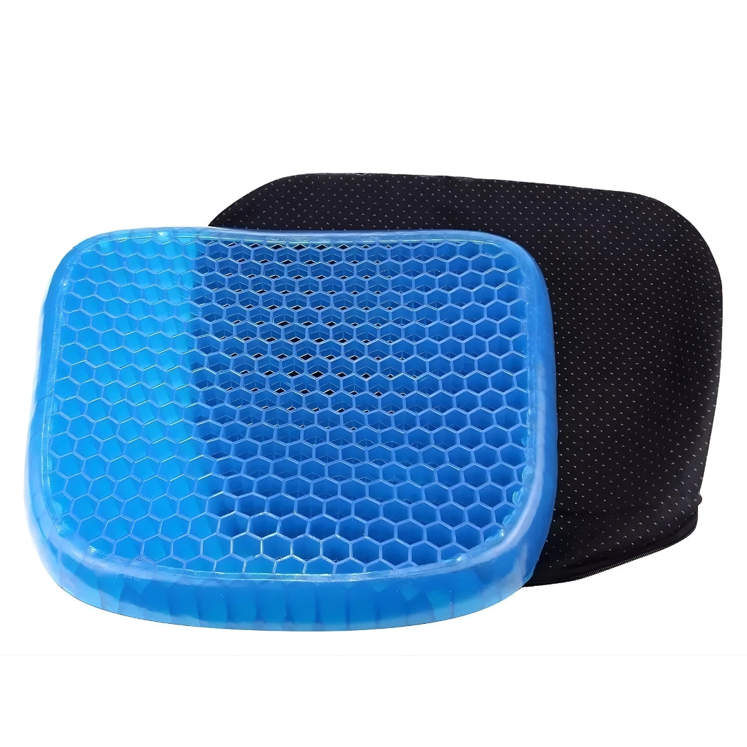 Almofada ortopédica em gel polimérico com estrutura honeycomb (colmeia) que distribui a pressão e melhora o conforto ao sentar. Acompanha capa com base antiderrapante, removível e lavável.