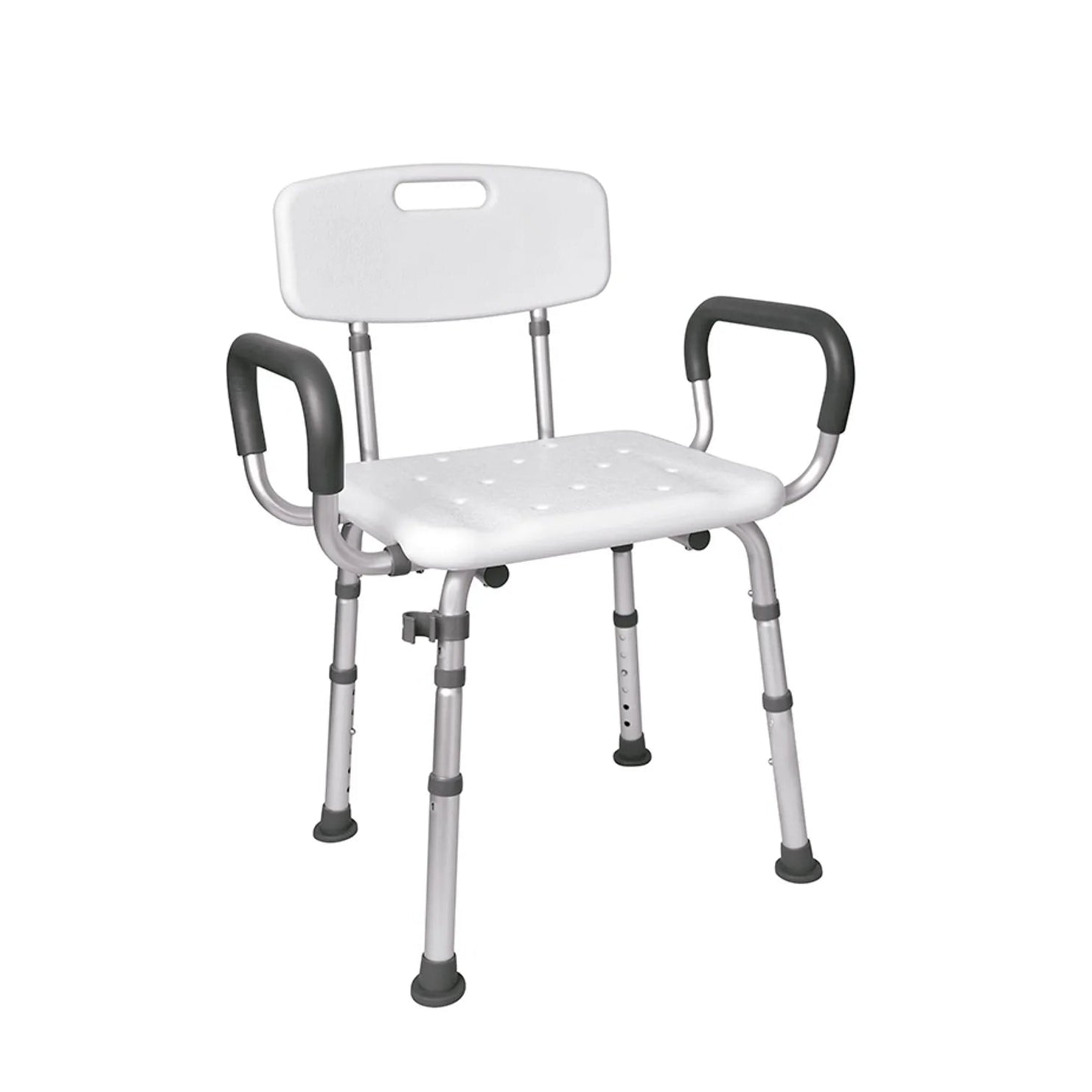 Banco de banho em alumínio, com encosto ergonômico e apoios de braço com revestimento em EVA. Assento anatômico com superfície texturizada e furos para escoamento, altura regulável e ponteiras antiderrapantes. Suporta até 135 kg e conta com encaixe para ducha.