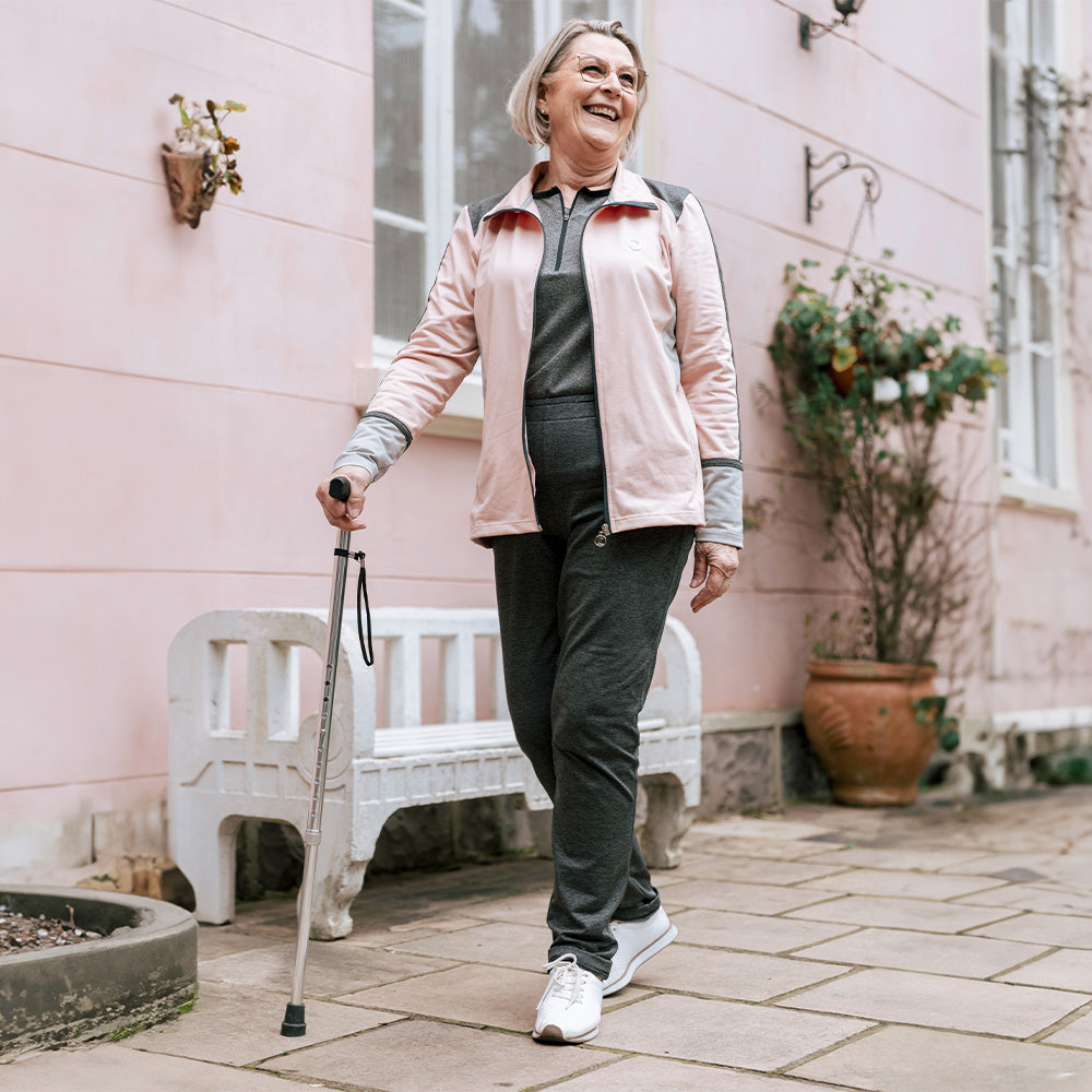 Estrutura em alumínio anodizado, 10 níveis de regulagem (?76–99 cm), ponteira com sistema antirruído e alça de punho. Leve (?0,3 kg), resistente e ideal para garantir apoio e estabilidade na marcha.