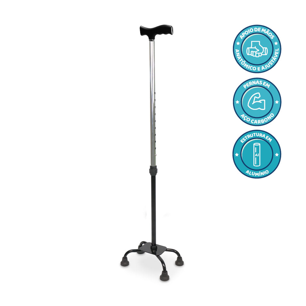 Uma bengala ergonômica com base de 4 apoios para estabilidade superior. Feita em alumínio anodizado (não enferruja), tem empunhadura anatômica, regulagem de altura em 10 níveis e ponteiras de borracha que ajudam a reduzir ruídos e deslizamentos.