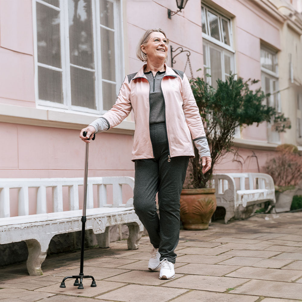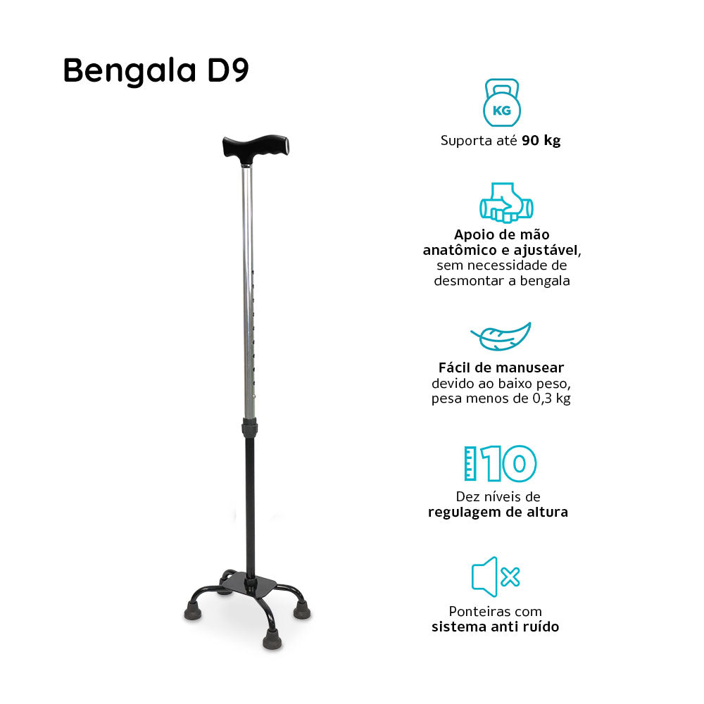 Bengala com base estável de 4 pontas, estrutura em alumínio anodizado (leve e resistente) e regulagem de altura em 10 níveis (64 a 94 cm). Suporta até 90 kg e possui empunhadura anatômica para mais conforto e segurança no dia a dia.