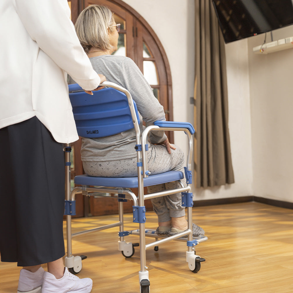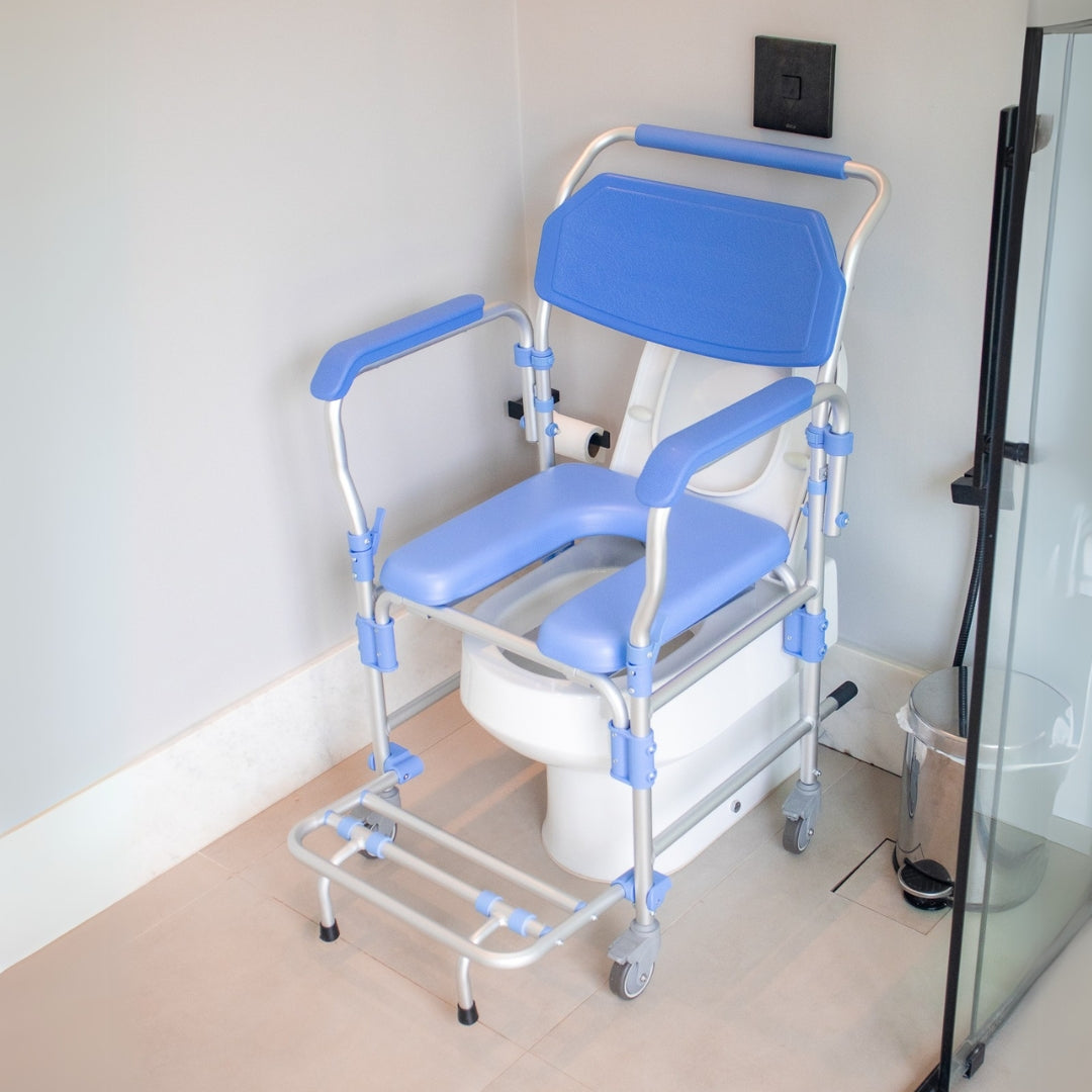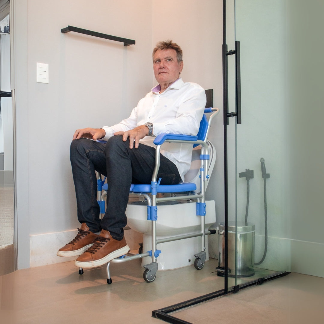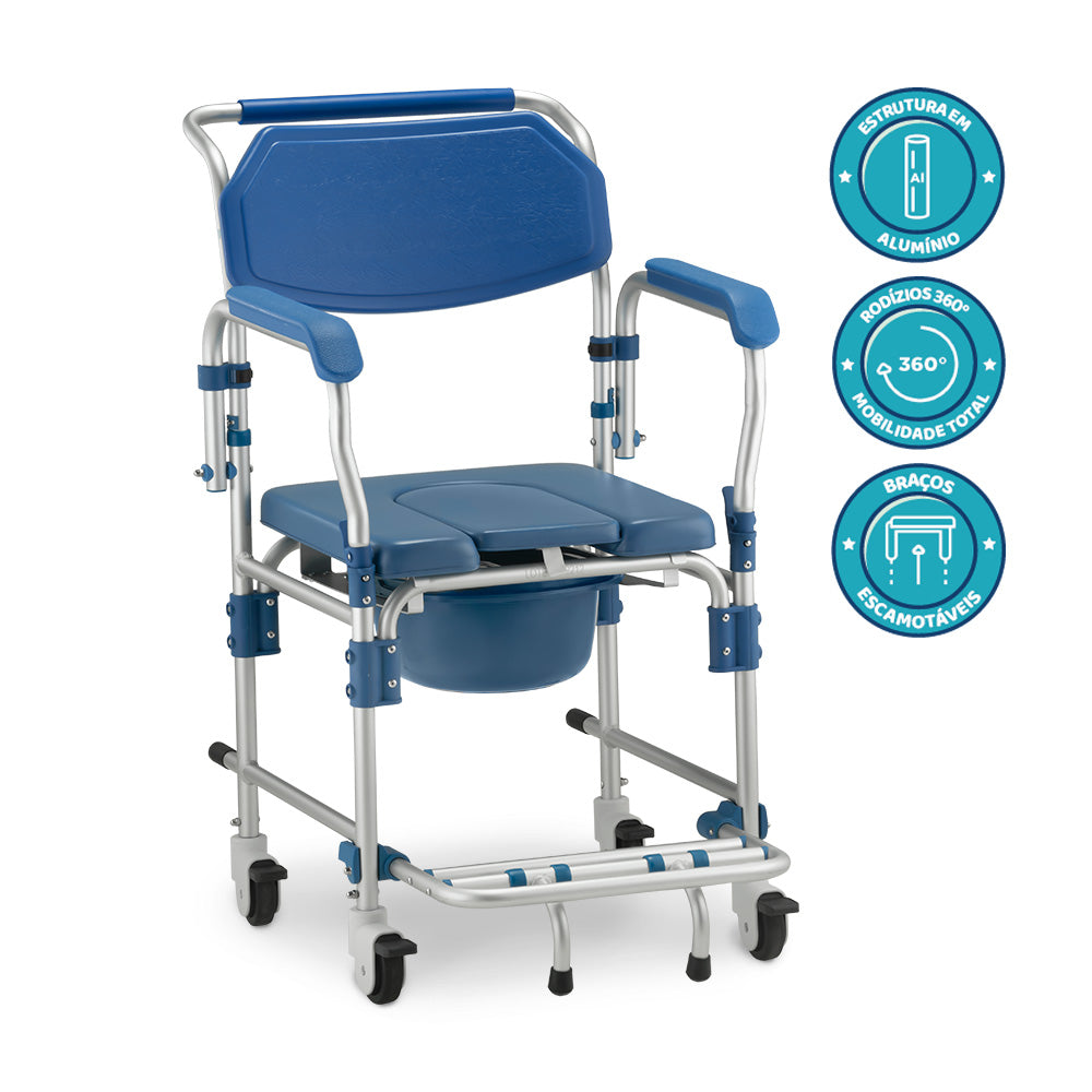 Uma cadeira sanitária para banho com estrutura em alumínio, projetada para oferecer segurança, autonomia e higiene facilitada. É desmontável, possui rodízios com freio e assento com recorte frontal que auxilia a limpeza íntima.
