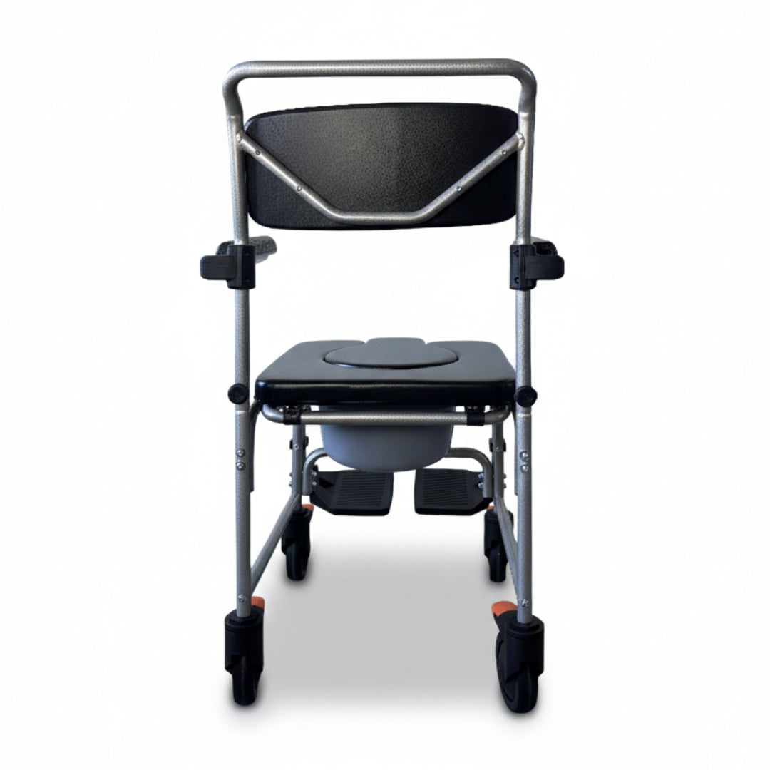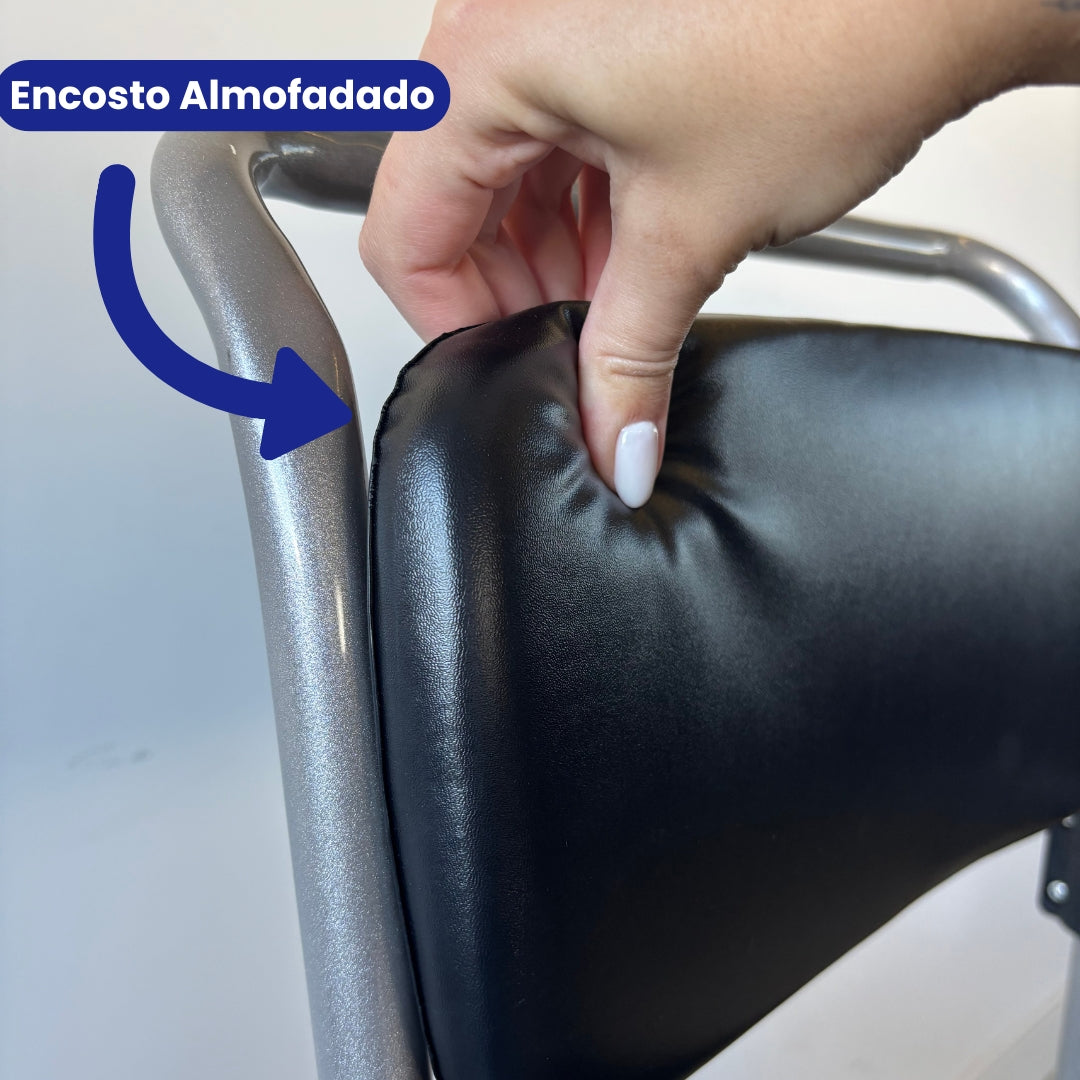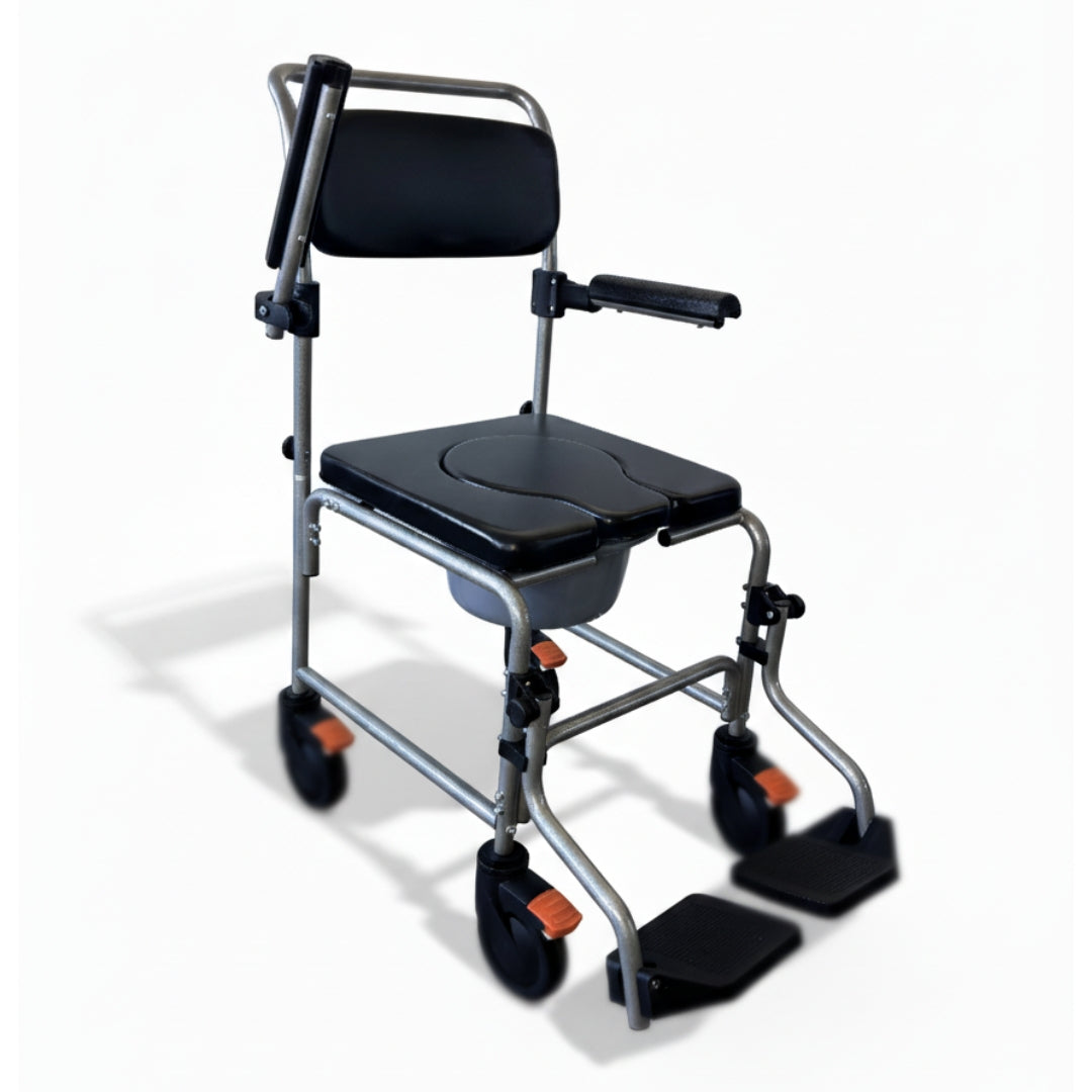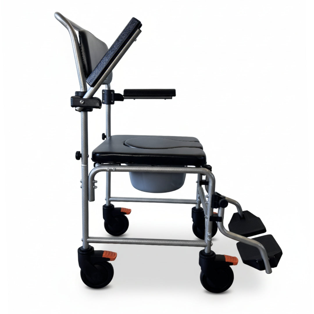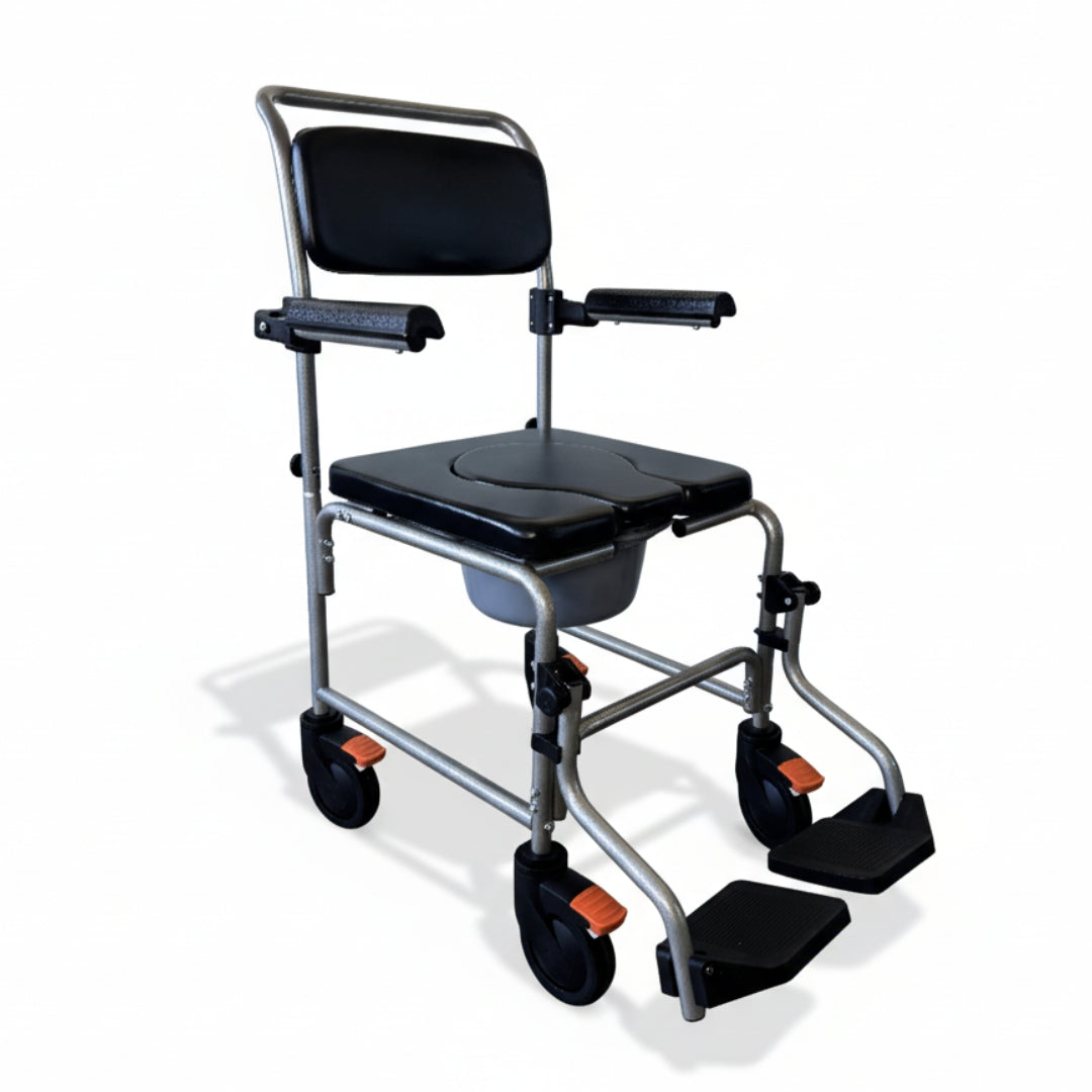 Cadeira de banho em alumínio, leve e resistente, com travas nas quatro rodas, braços escamoteáveis e assento anatômico. Segurança, conforto e praticidade para a rotina de higiene.