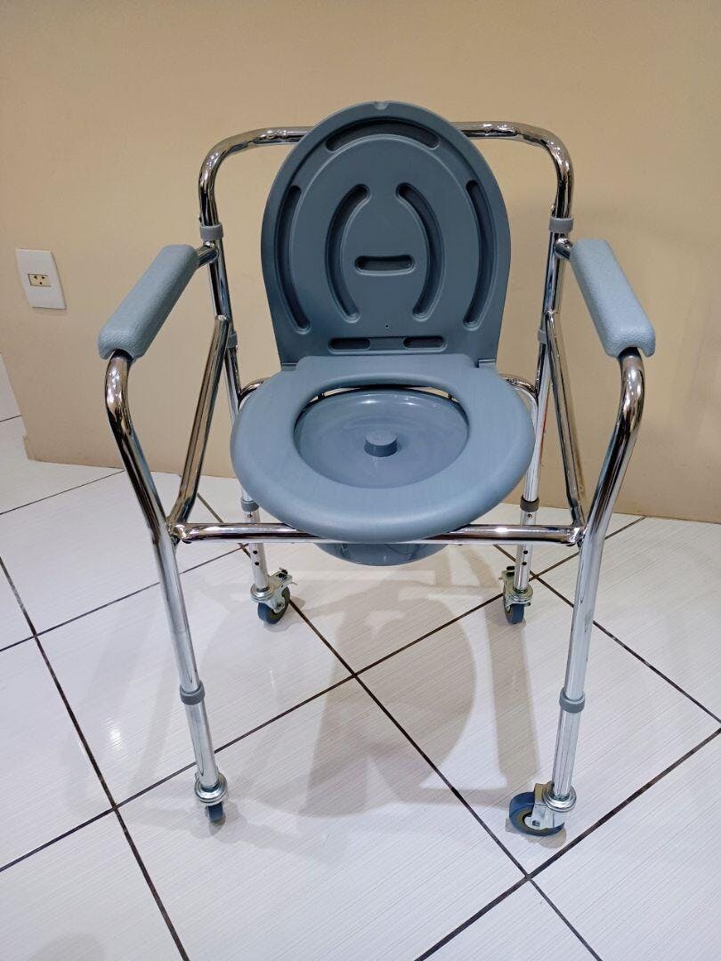 Estrutura em aço com pintura epóxi, 4 rodízios giratórios (traseiros com freio), assento sanitário com tampa rebatível e altura ajustável em 5 níveis. Higiene e segurança no dia a dia, com mobilidade facilitada.