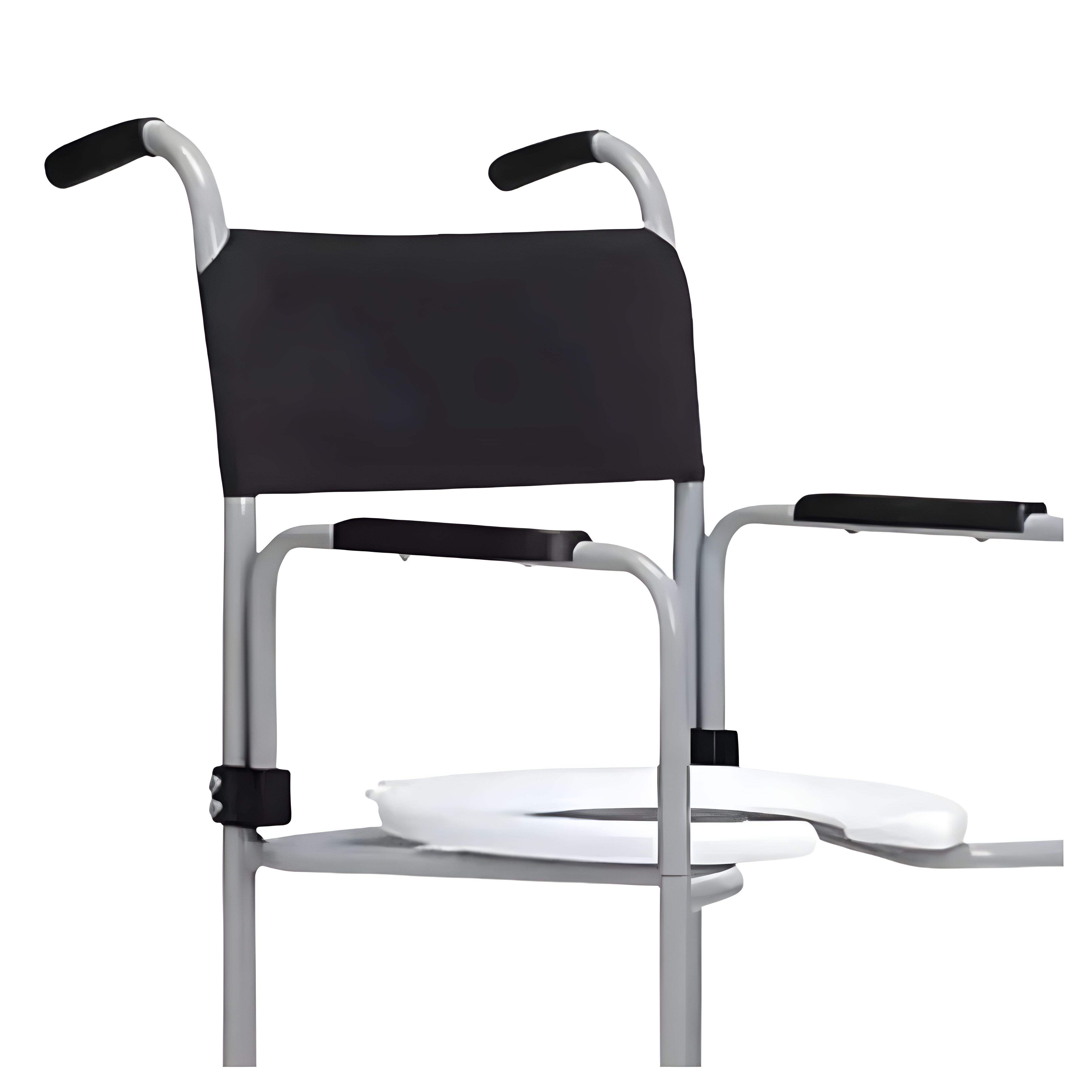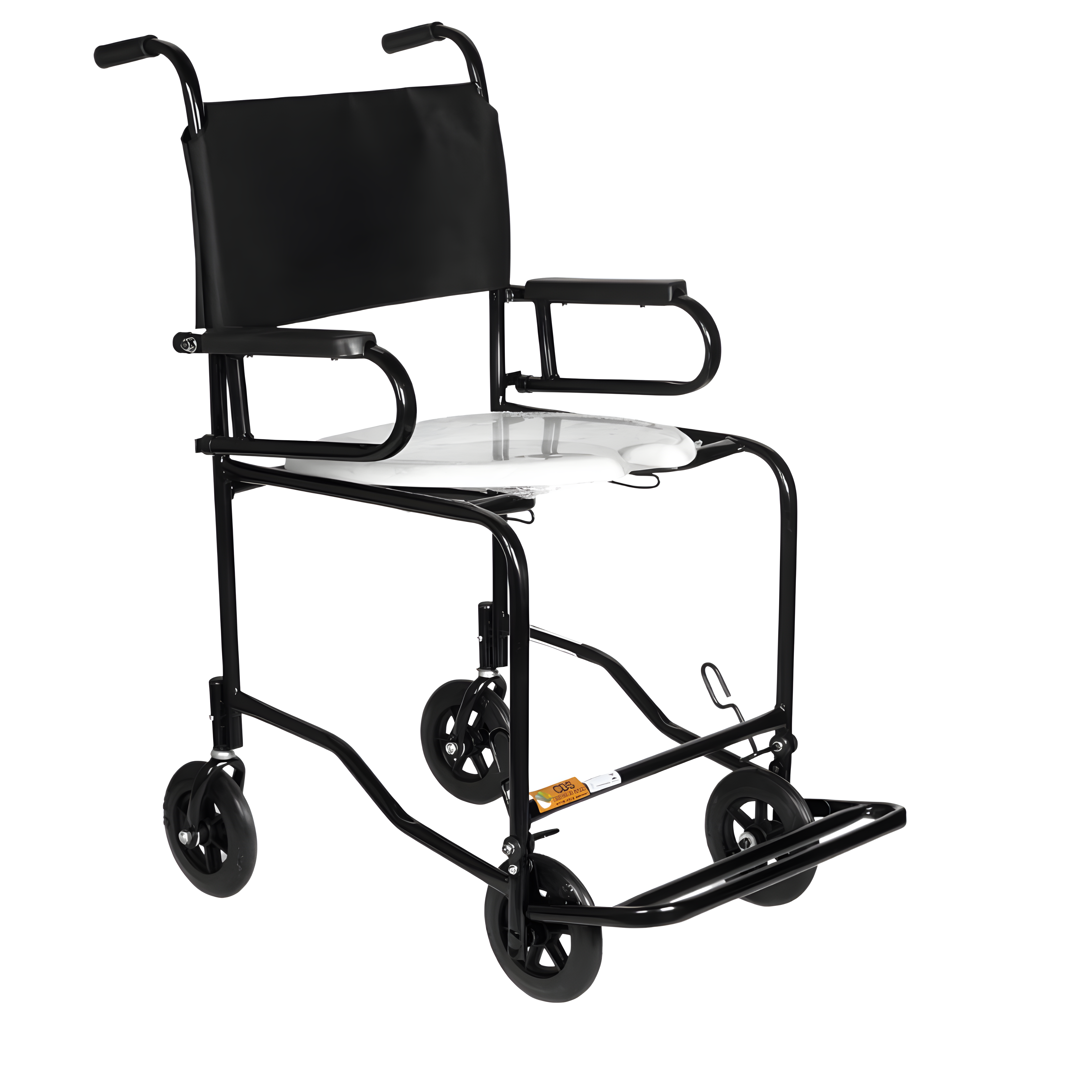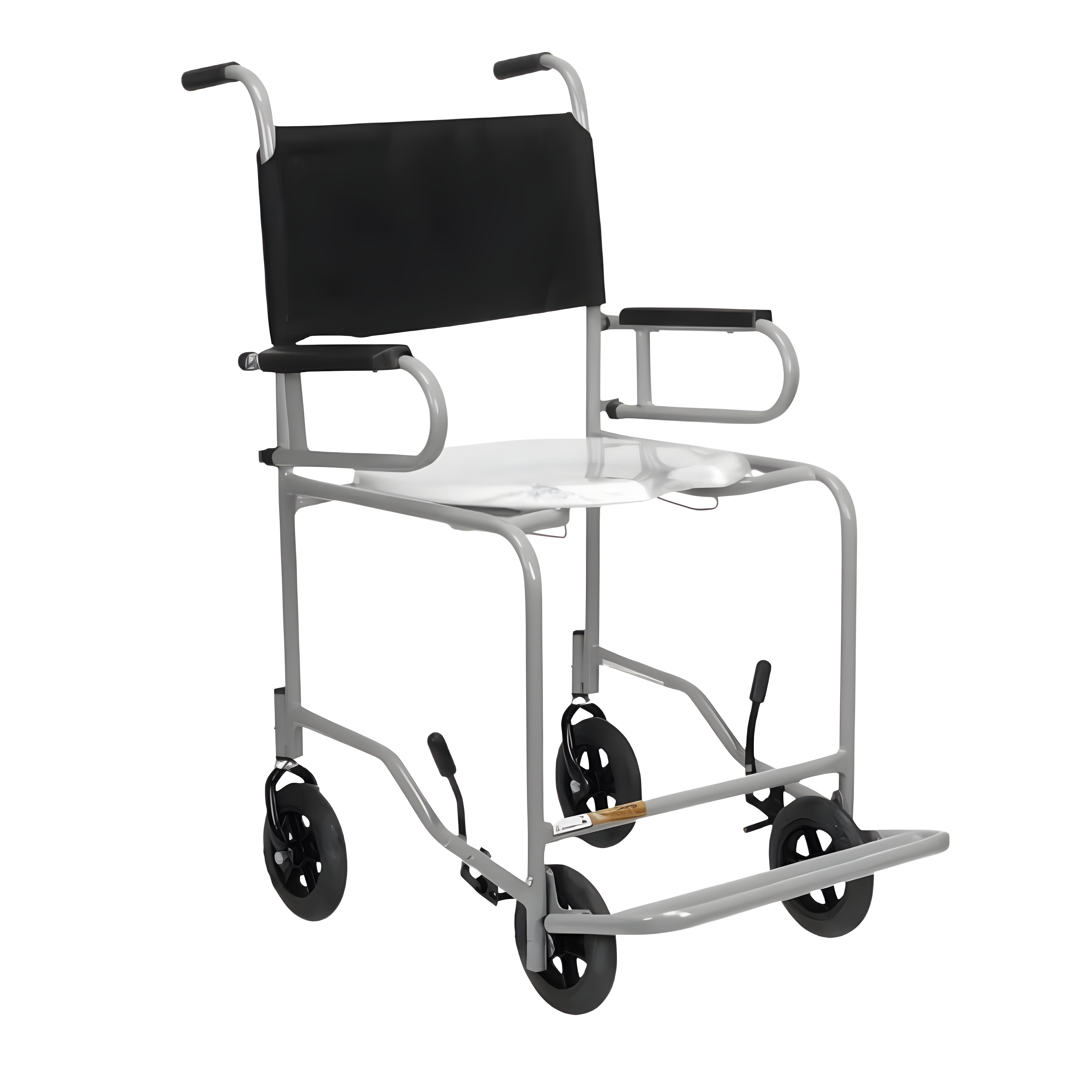 Segurança e praticidade no banho e no sanitário. Modelo escamoteável com rodas 6” maciças, freios bilaterais e assento anatômico removível.