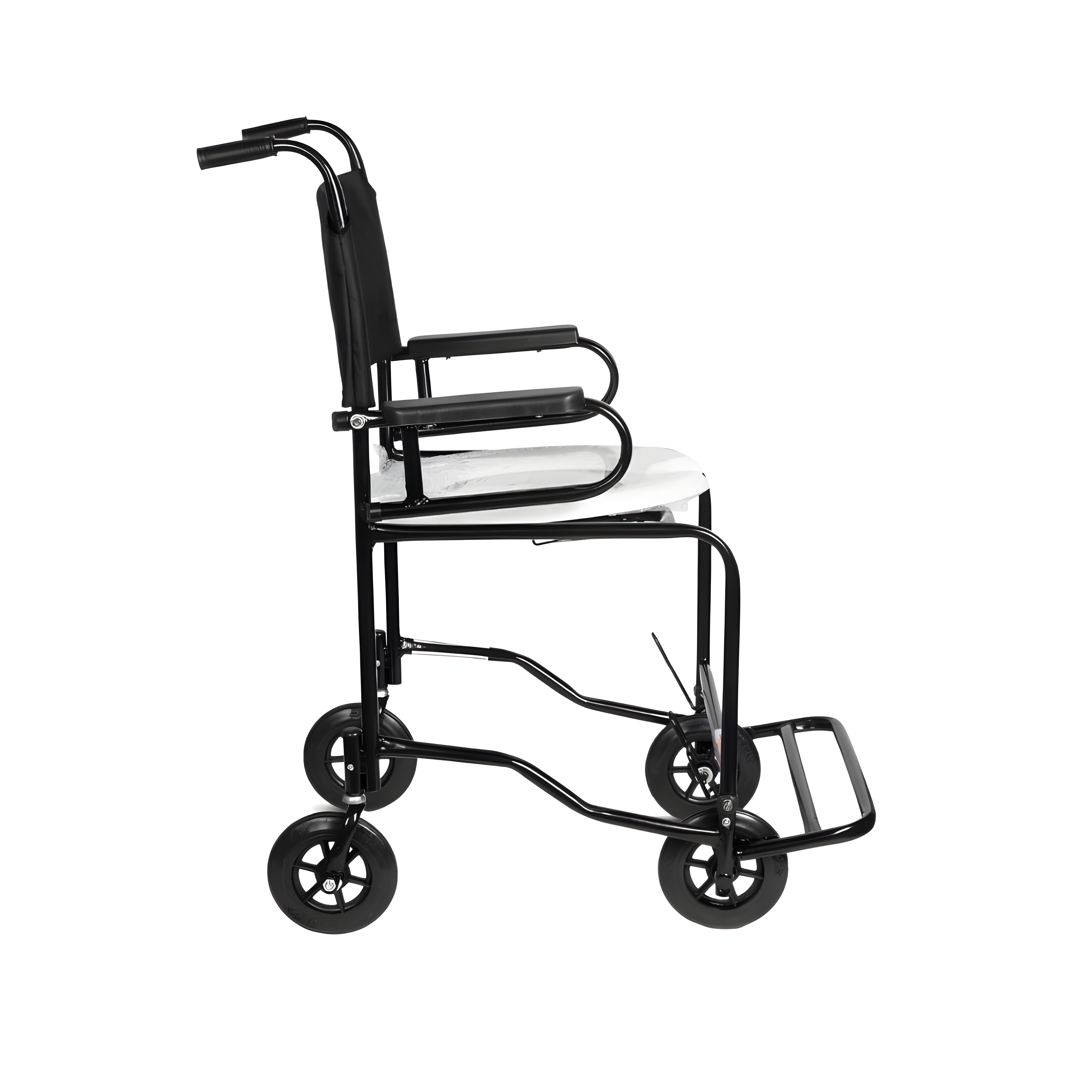 Cadeira higiênica com estrutura em aço carbono e acabamento epóxi, assento anatômico removível e rodas 6” maciças com freios bilaterais. Capacidade indicada: até 85 kg.