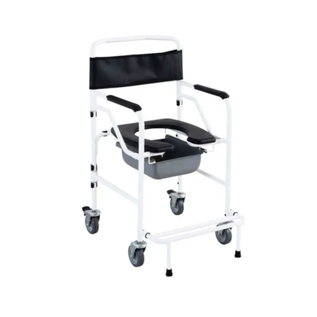 Uma cadeira sanitária para banho com estrutura em aço pintado, dobrável para facilitar o transporte e a guarda, assento com abertura frontal e comadre/bacia coletora removível, garantindo higiene e segurança no dia a dia.