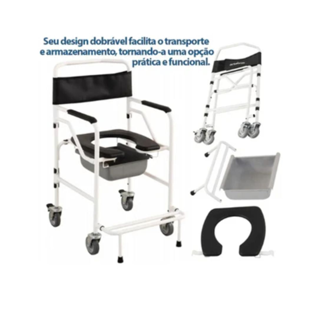 Cadeira de banho dobrável e resistente, com estrutura em aço, assento higiênico com abertura sanitária e comadre/balde coletor removível. Ideal para quem busca segurança, praticidade e conforto na rotina de higiene.