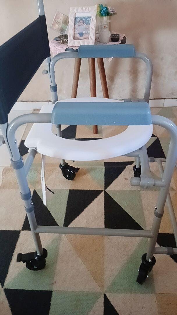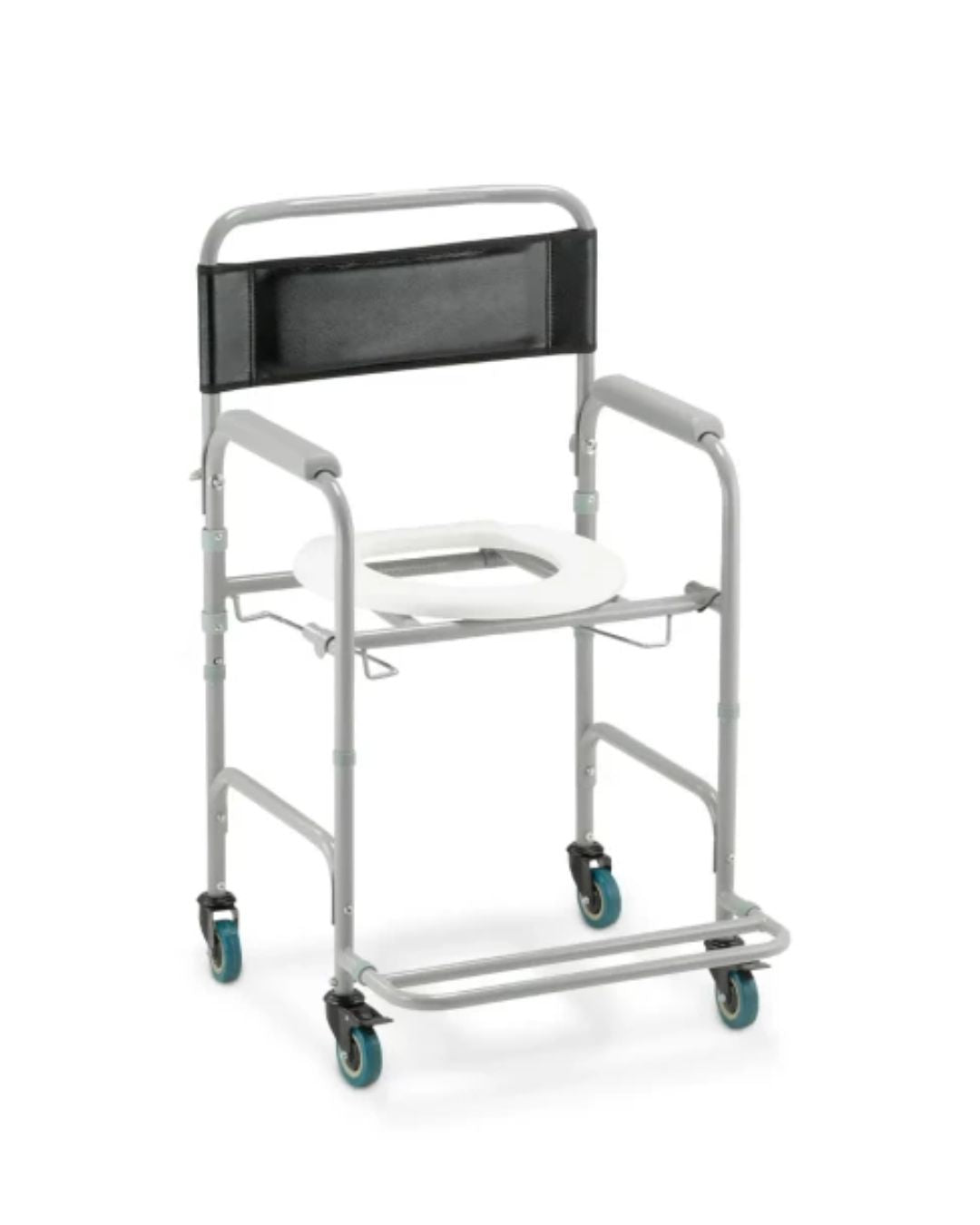 Uma cadeira higiênica dobrável, com estrutura em aço carbono com pintura epóxi, rodízios 360º com freio e apoio de pés. Oferece segurança no banho e pode ser usada como sobre o vaso, facilitando a rotina do usuário e do cuidador.