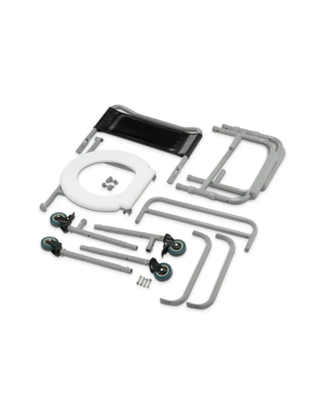 Cadeira higiênica dobrável e desmontável, com estrutura em aço carbono (pintura epóxi), rodízios giratórios 360º com freio, apoio de pés e assento/encosto em material plástico. Indicada para banho e uso como sobrevaso, garantindo segurança, autonomia e praticidade.