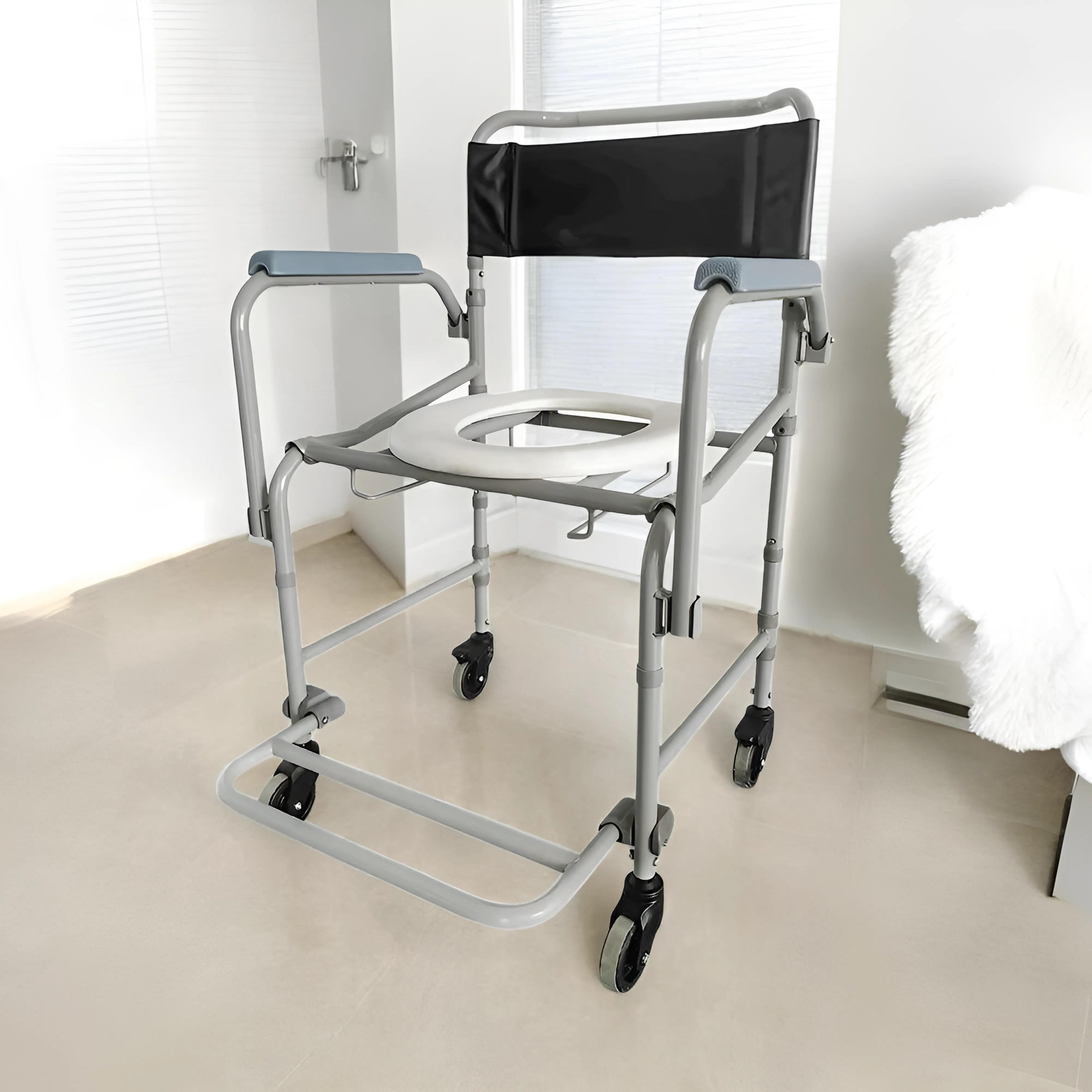 Suporta banho, uso no vaso sanitário e uso com comadre — sem trocar de cadeira.