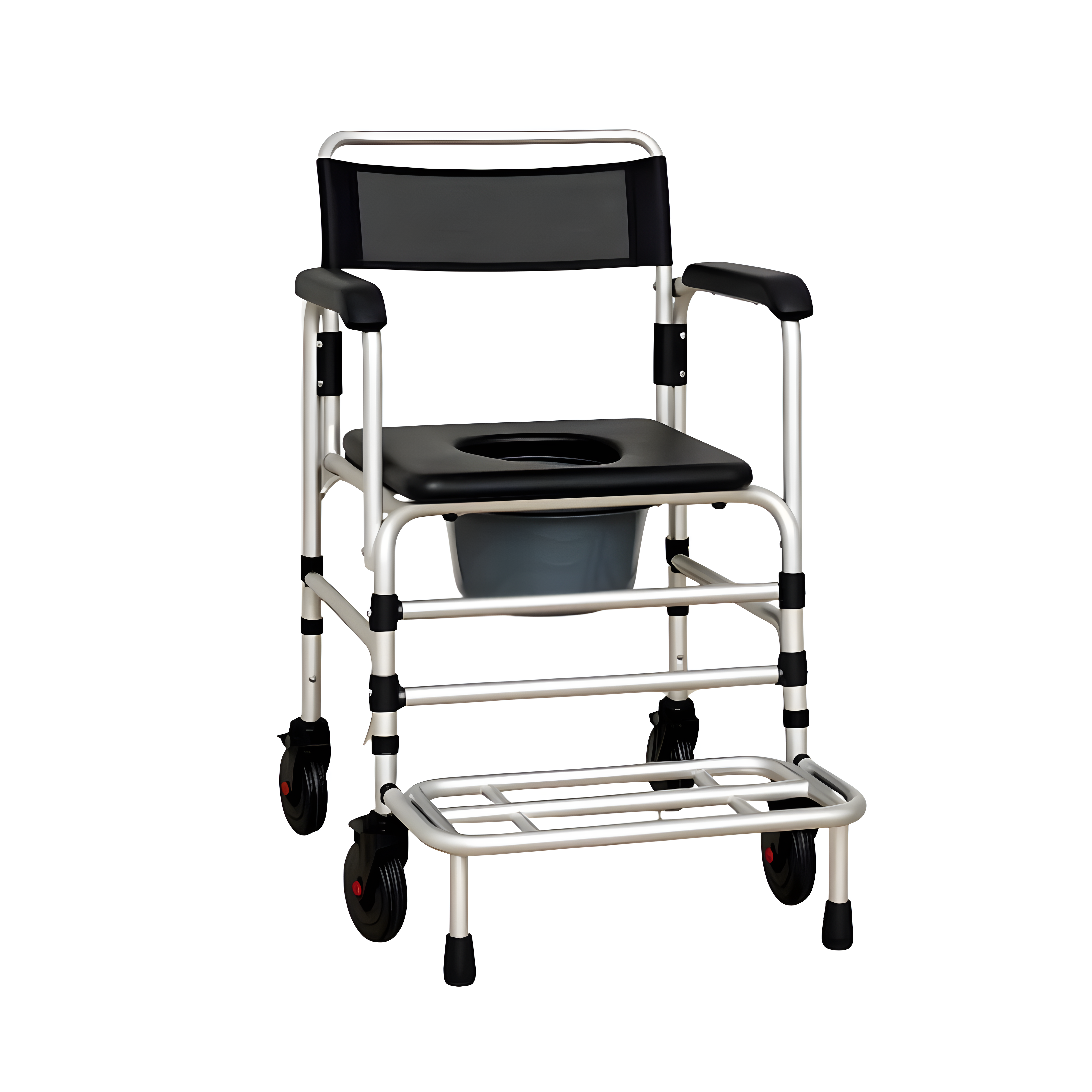 Estrutura em alumínio (leve e resistente à oxidação), dobrável, com coletor sanitário integrado, rodas com trava e regulagem de altura. Pensada para oferecer segurança, autonomia e higiene facilitada no dia a dia.