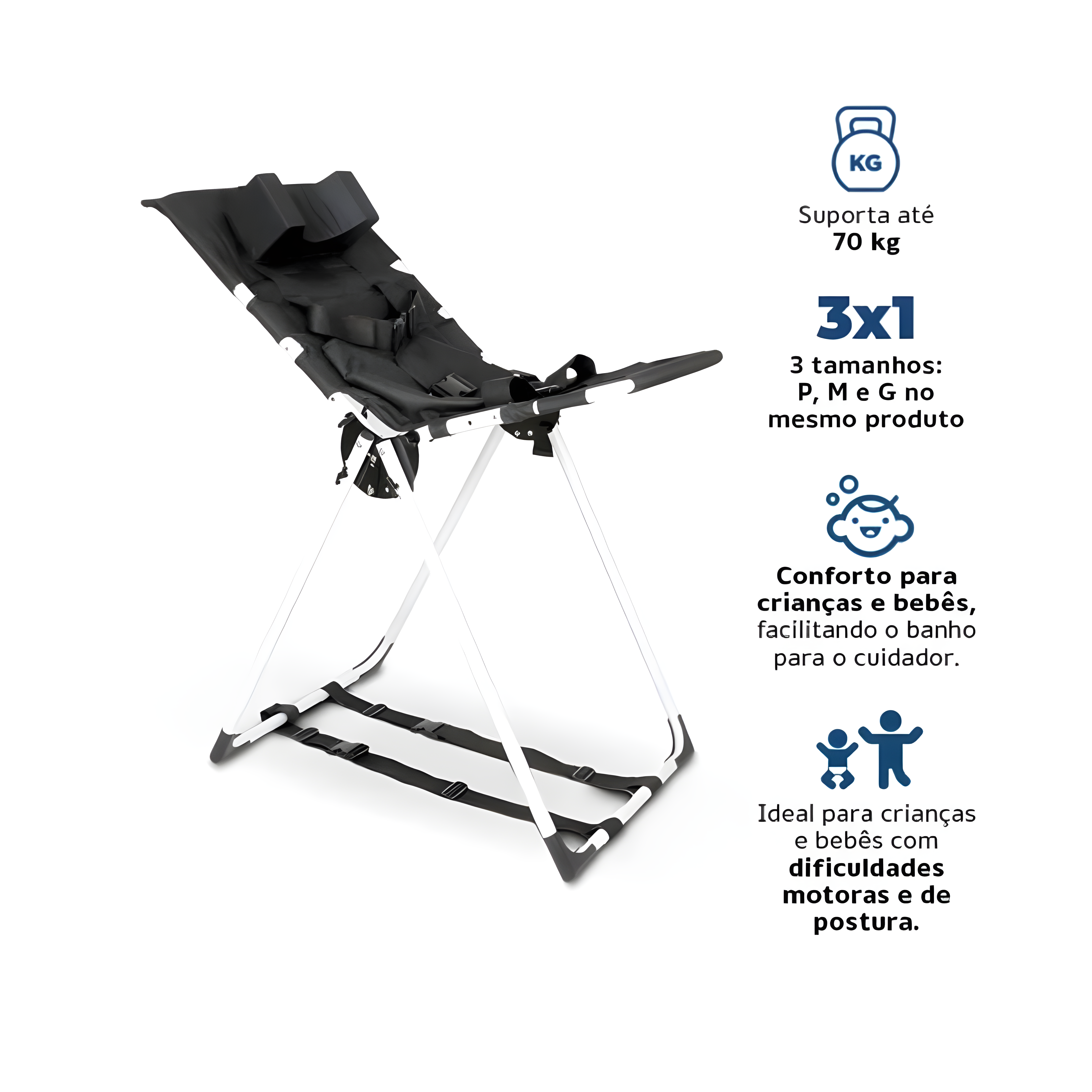 É uma cadeira infantil para banho e uso sanitário com assento em concha, desenvolvida para oferecer segurança e autonomia às crianças. A concha anatômica envolve o tronco, melhora o posicionamento e torna a higiene mais prática para o cuidador.