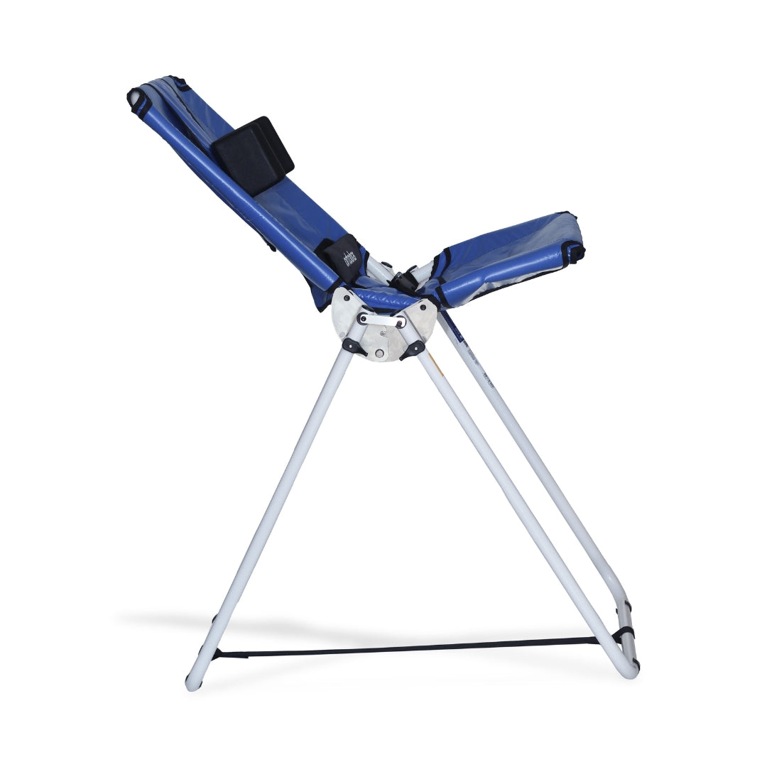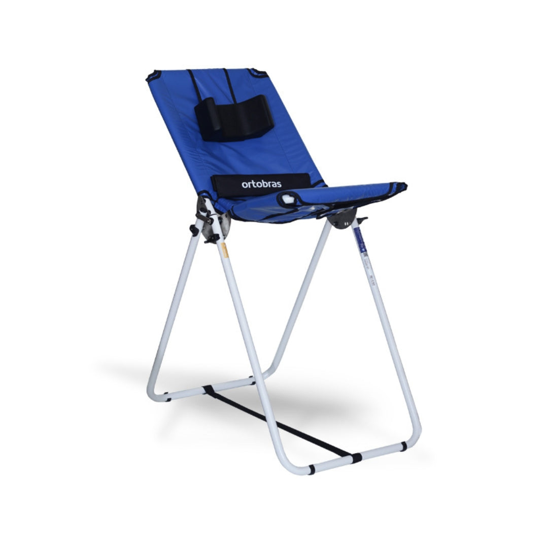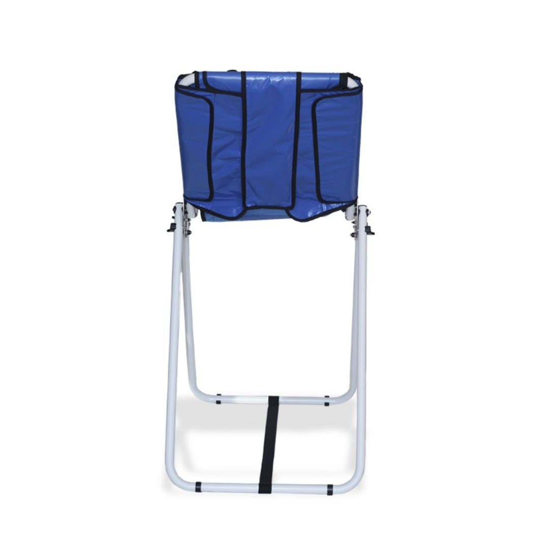 Cadeira infantil para banho com estrutura em alumínio (antiferrugem), concha anatômica acolchoada e impermeável, dobrável para transporte, cinto de posicionamento e apoio de cabeça. Disponível nos tamanhos P, M e G.
