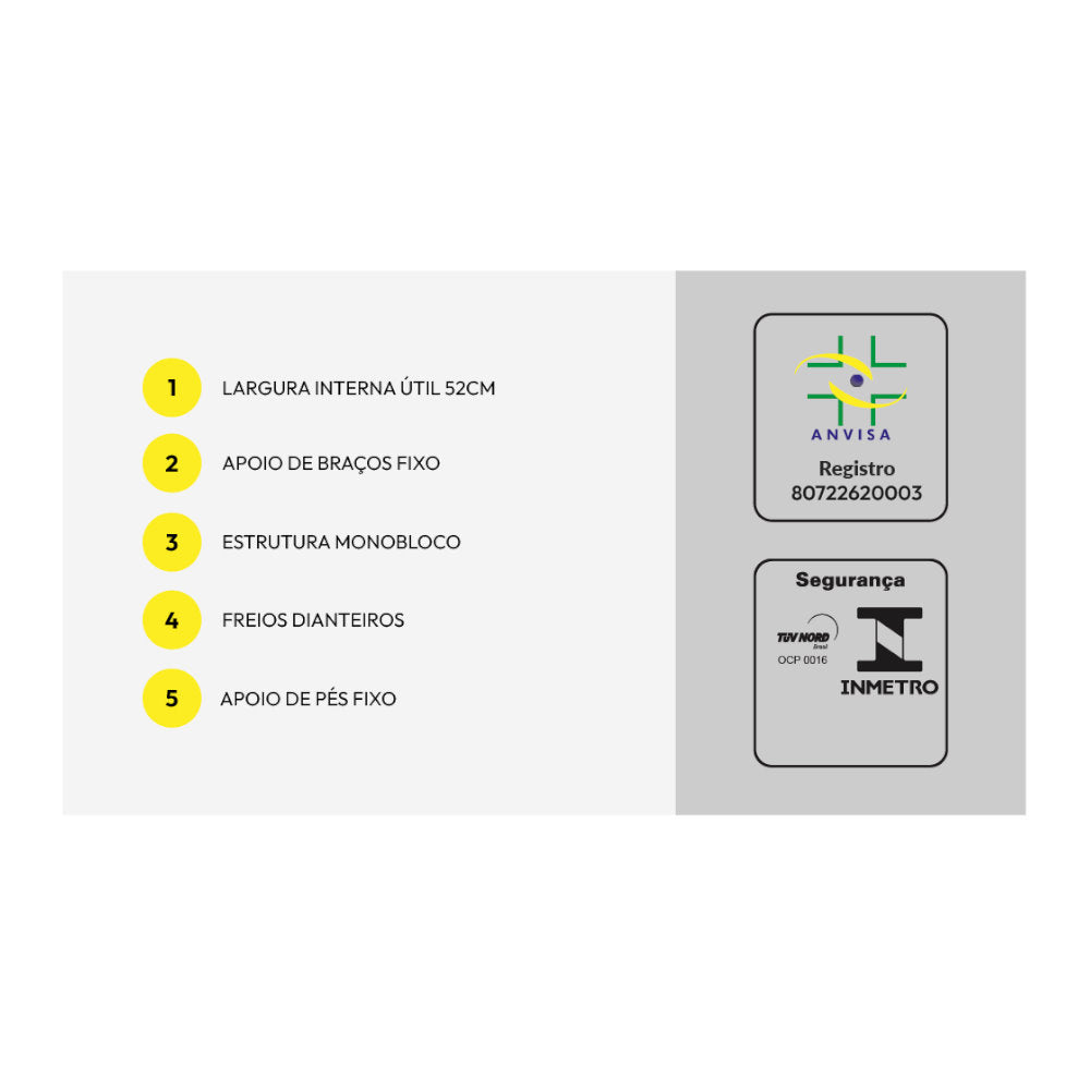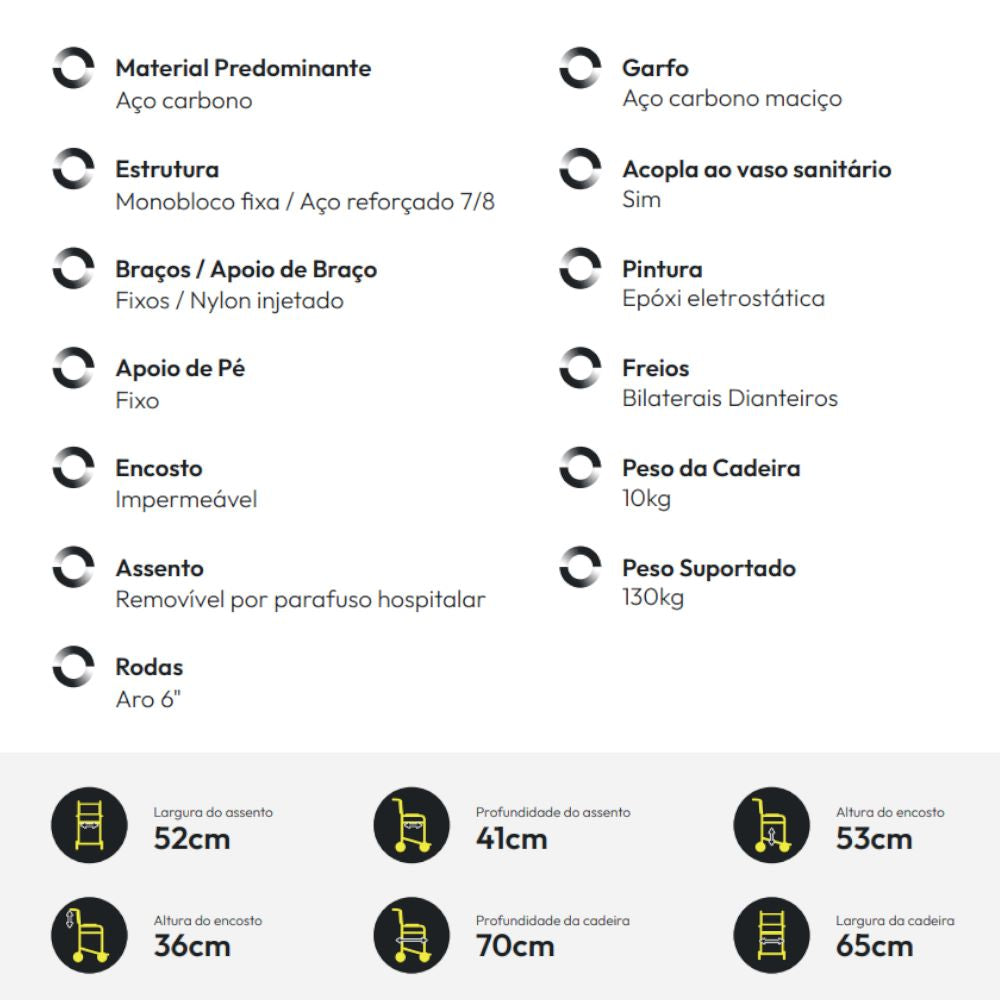 Cadeira de banho reforçada com estrutura em aço carbono e assento sanitário, projetada para usuários de maior porte. Largura de assento ampla (? 52 cm), freios dianteiros bilaterais e rodízios 6" para manobra segura. Capacidade de peso até 130 kg.