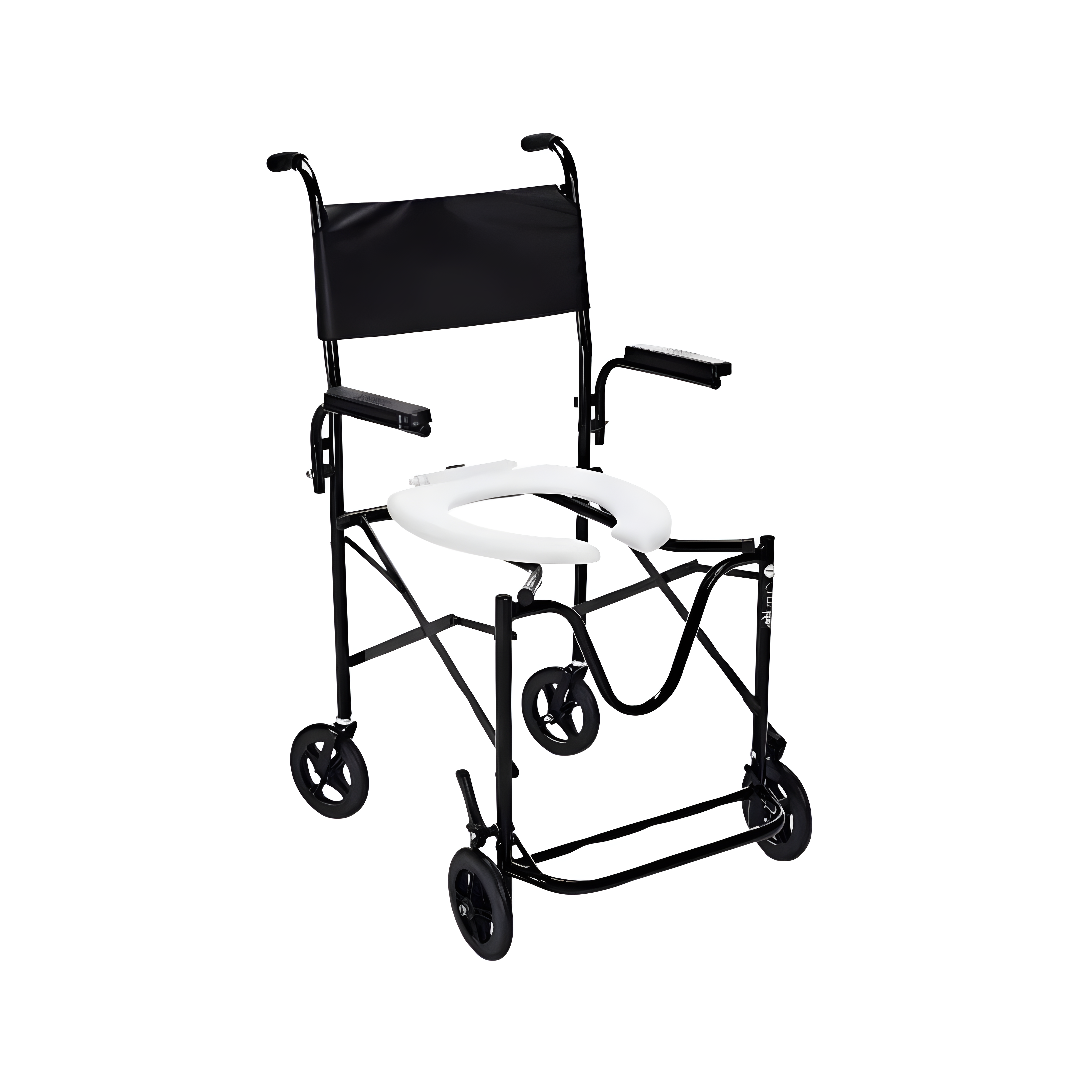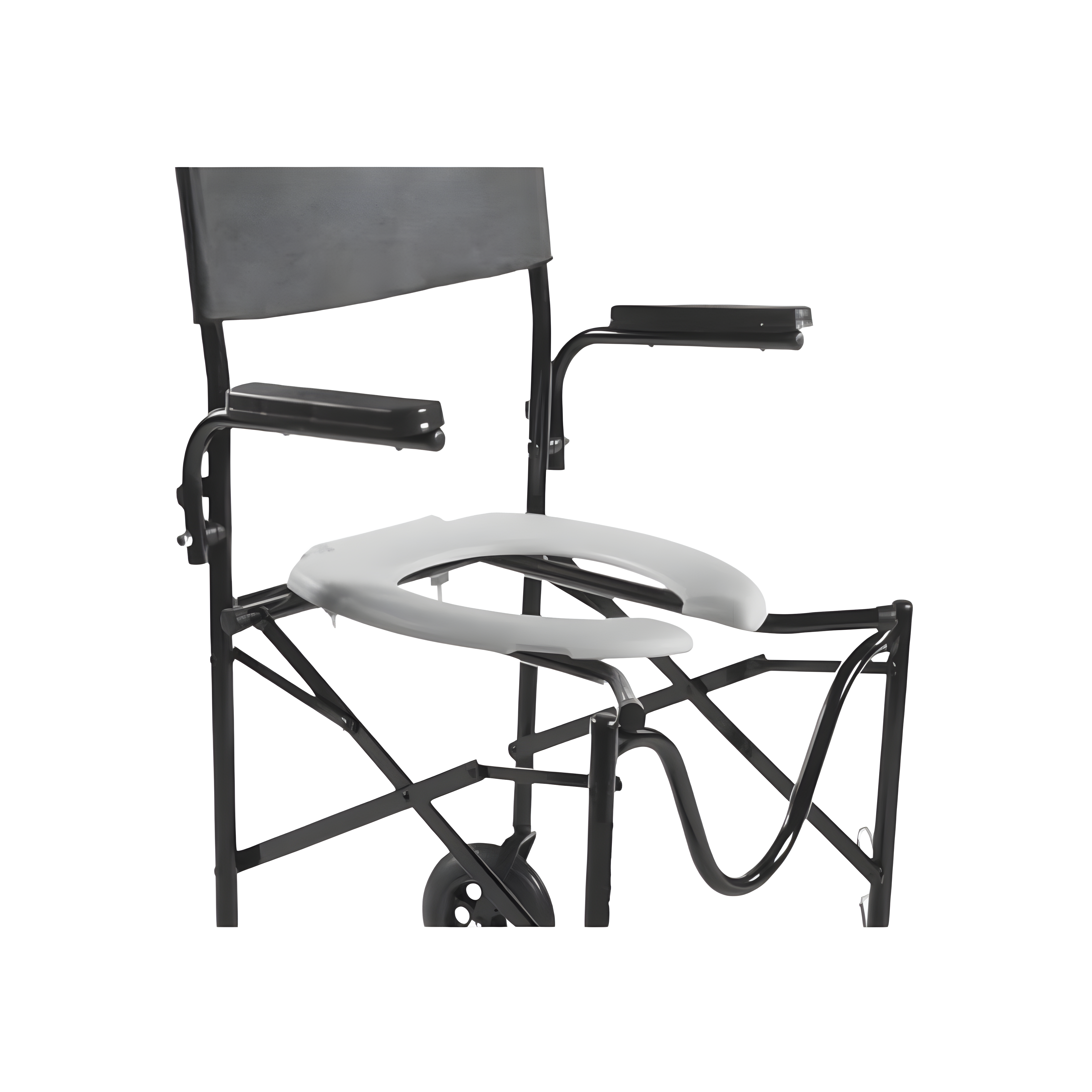 Cadeira higiênica dobrável com 4 rodas, ideal para banho e uso sobre o vaso sanitário. Possui assento com tampa e coletor removível, unindo mobilidade e higiene.