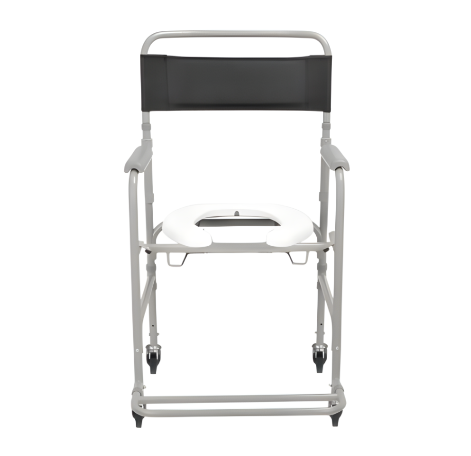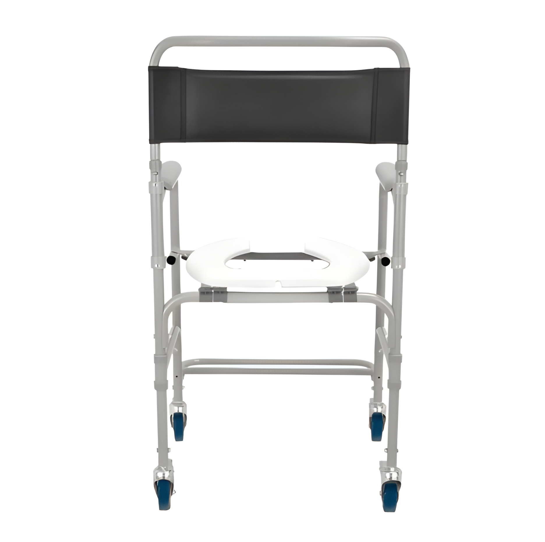 Cadeira higiênica para banho e uso sanitário com estrutura em aço carbono, pintura epóxi e encosto acolchoado. Dobrável para transportar e guardar com facilidade, com rodízios com freio e assento sanitário para higiene íntima segura.