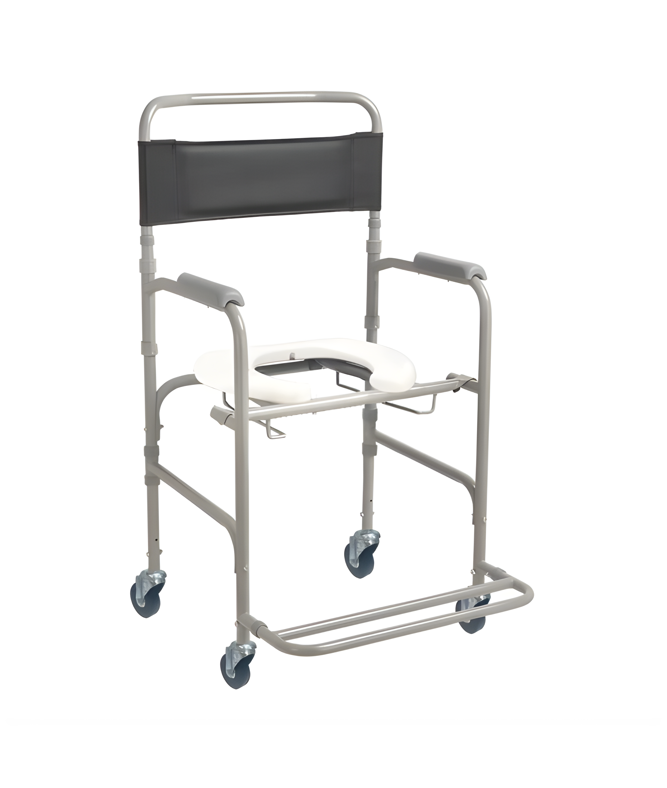 É uma cadeira higiênica de uso domiciliar e institucional, feita em aço carbono com pintura epóxi, dobrável para facilitar transporte e armazenamento. Conta com assento sanitário, encosto acolchoado e rodízios com freio que trazem segurança no banho.