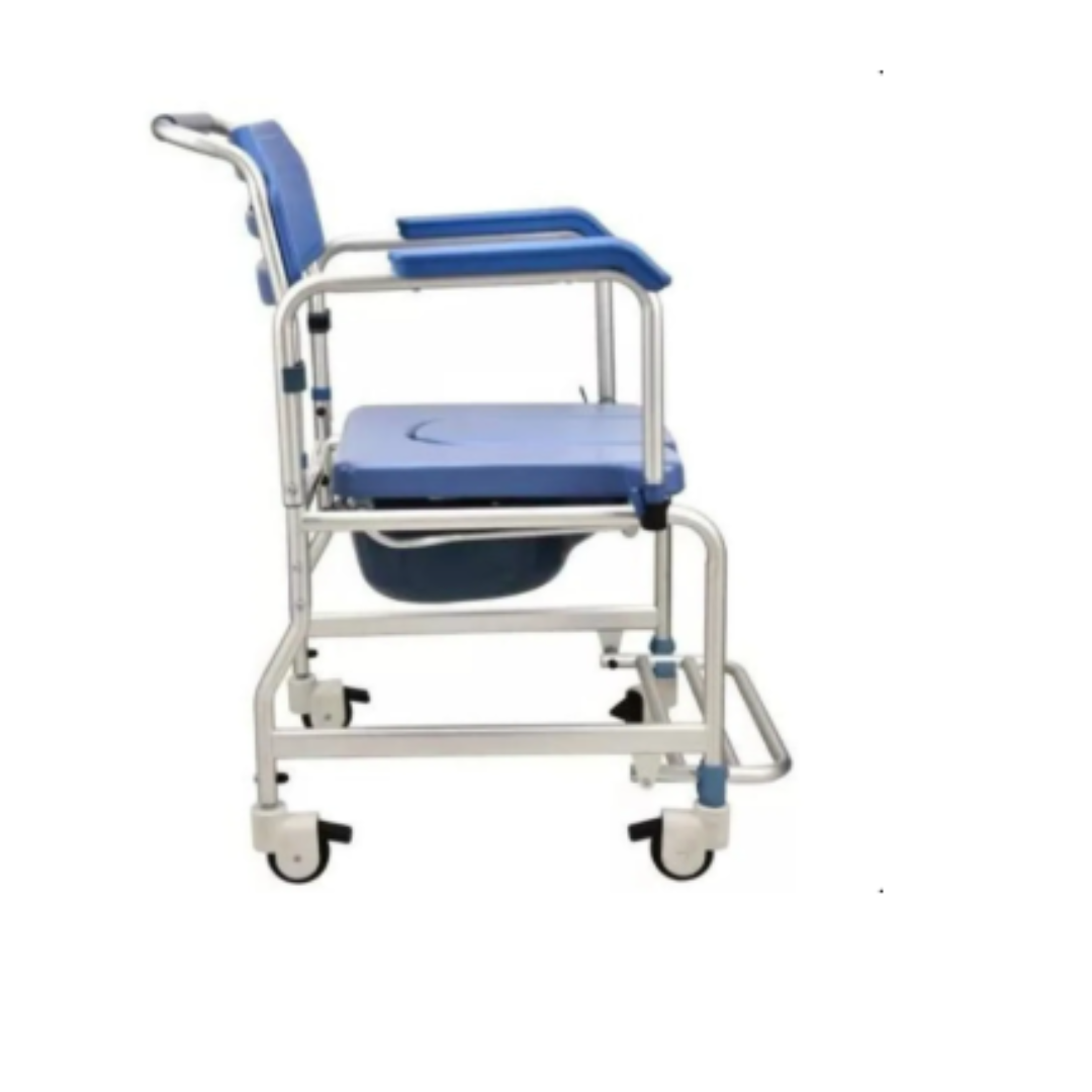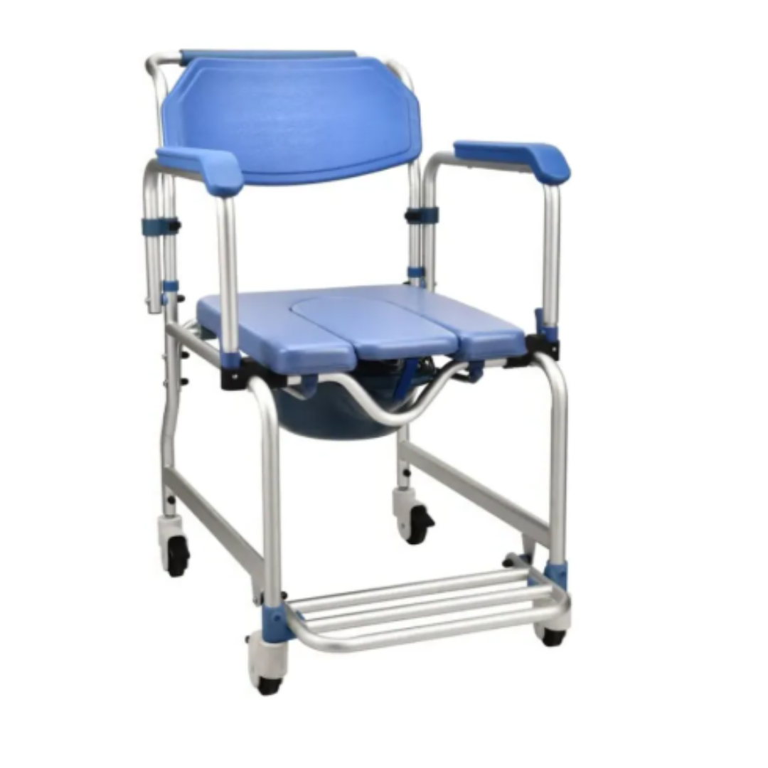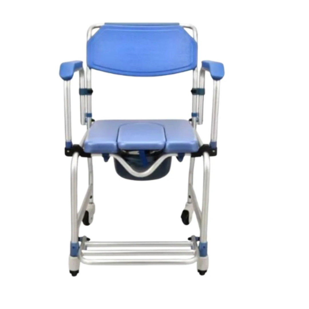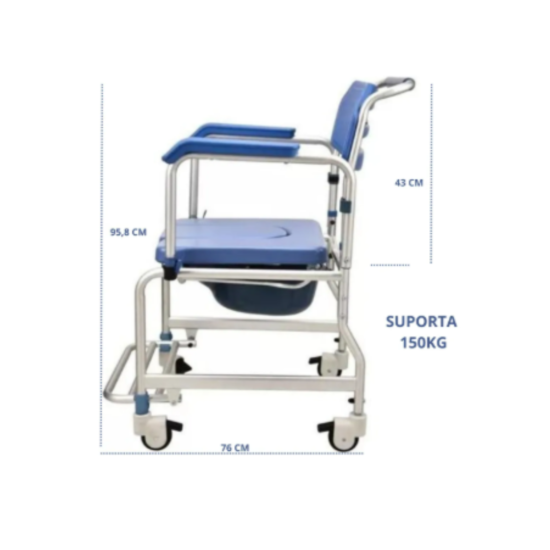 Cadeira 4 em 1 para banho, uso sobre o vaso, higiene e locomoção interna. Estrutura em alumínio com pintura epóxi (antiferrugem), assento acolchoado impermeável com tampa, comadre inclusa, apoio de pés rebatível e 4 rodízios 360° com travas.