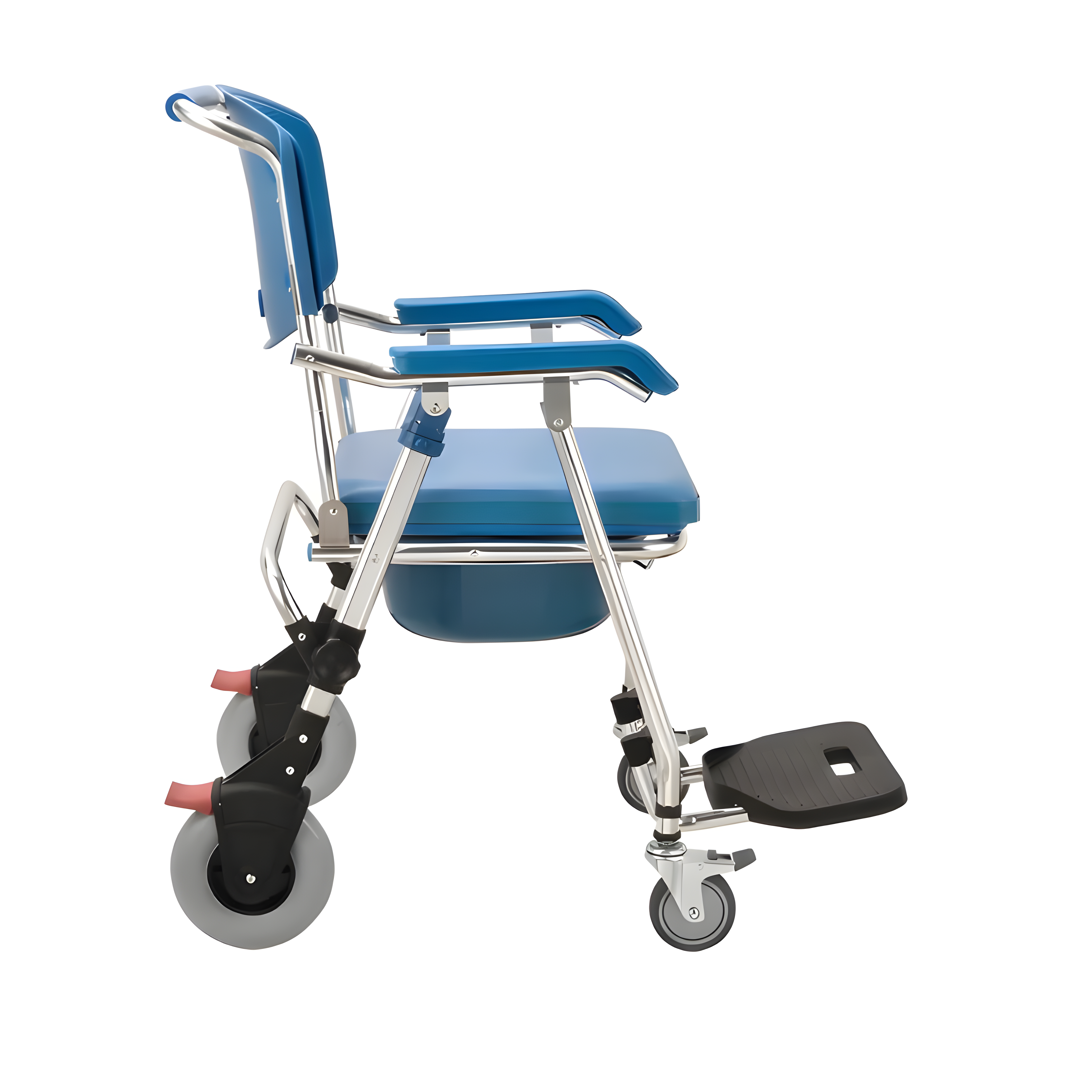 Cadeira 4 em 1 para banho, uso sobre o vaso, higiene e locomoção interna. Estrutura em alumínio antiferrugem, assento acolchoado impermeável com tampa, comadre inclusa, braços escamoteáveis, apoio de pés rebatível e 4 rodízios 360° com travas.