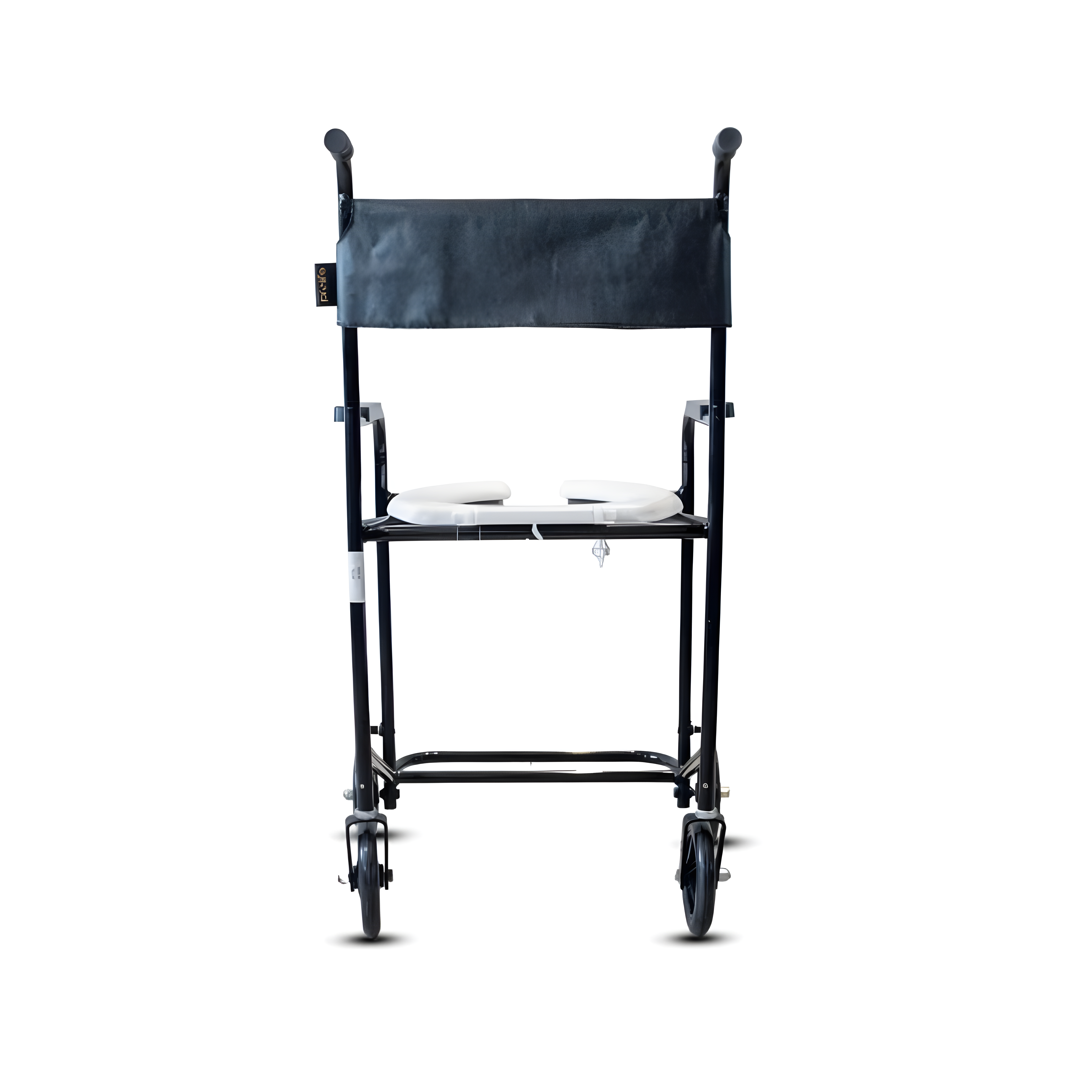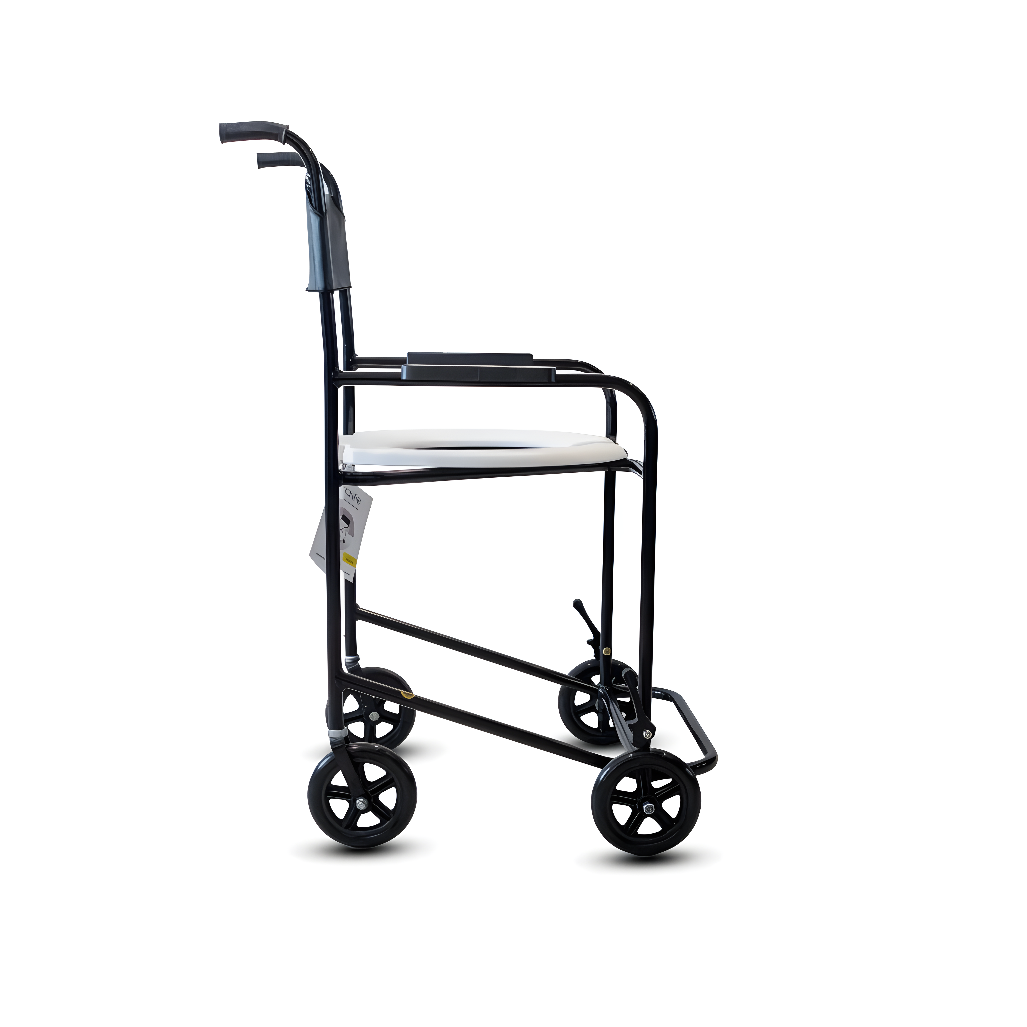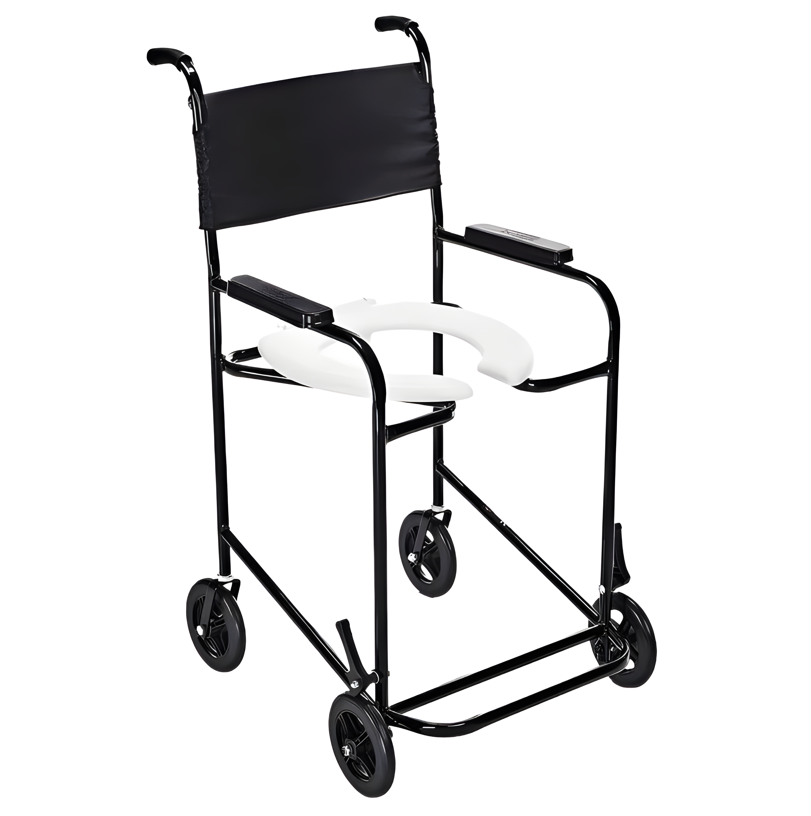 Cadeira higiênica compacta, estrutura monobloco em aço carbono, com assento sanitário removível e rodízios de 6" para uso no banho e auxílio no vaso sanitário.