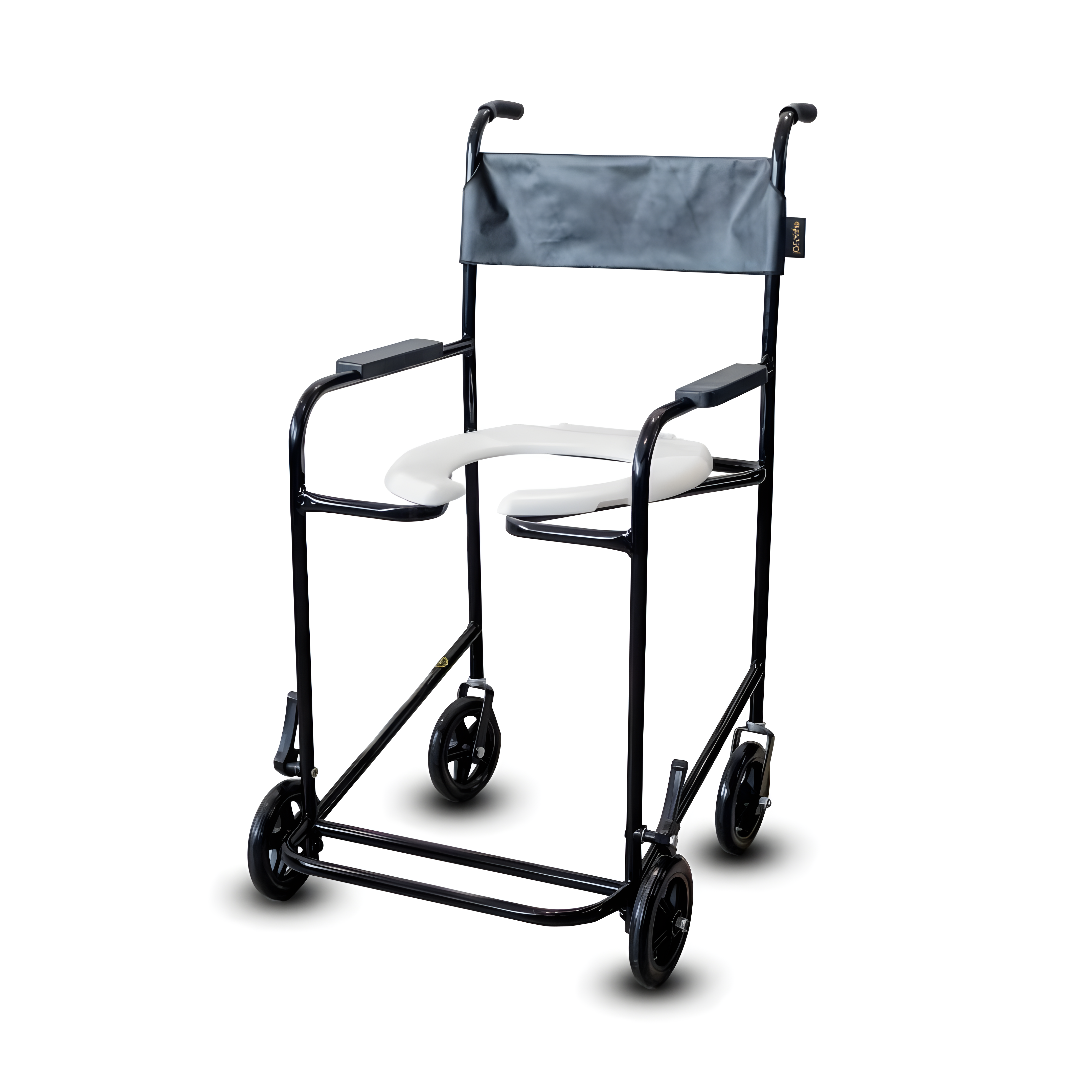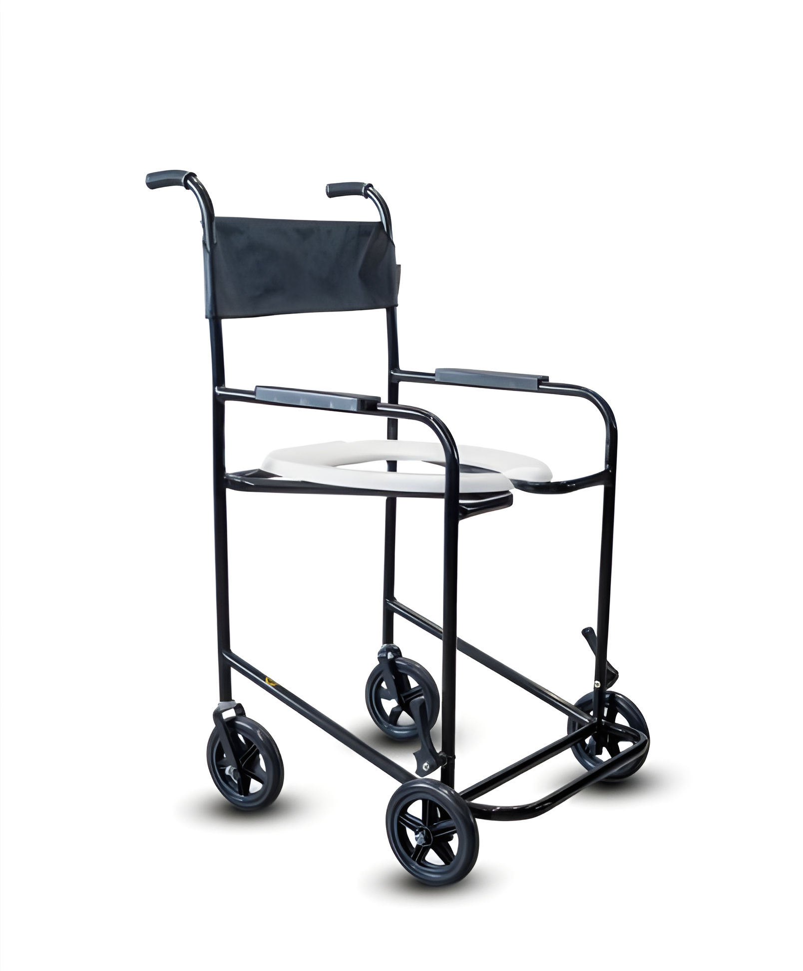 Modelo prático para banho e higiene íntima com estrutura fixa em aço carbono e pintura epóxi eletrostática. Possui assento sanitário removível por parafusos, apoio de braços fixos e apoio de pés fixo, com rodízios de 6" e freios para segurança.