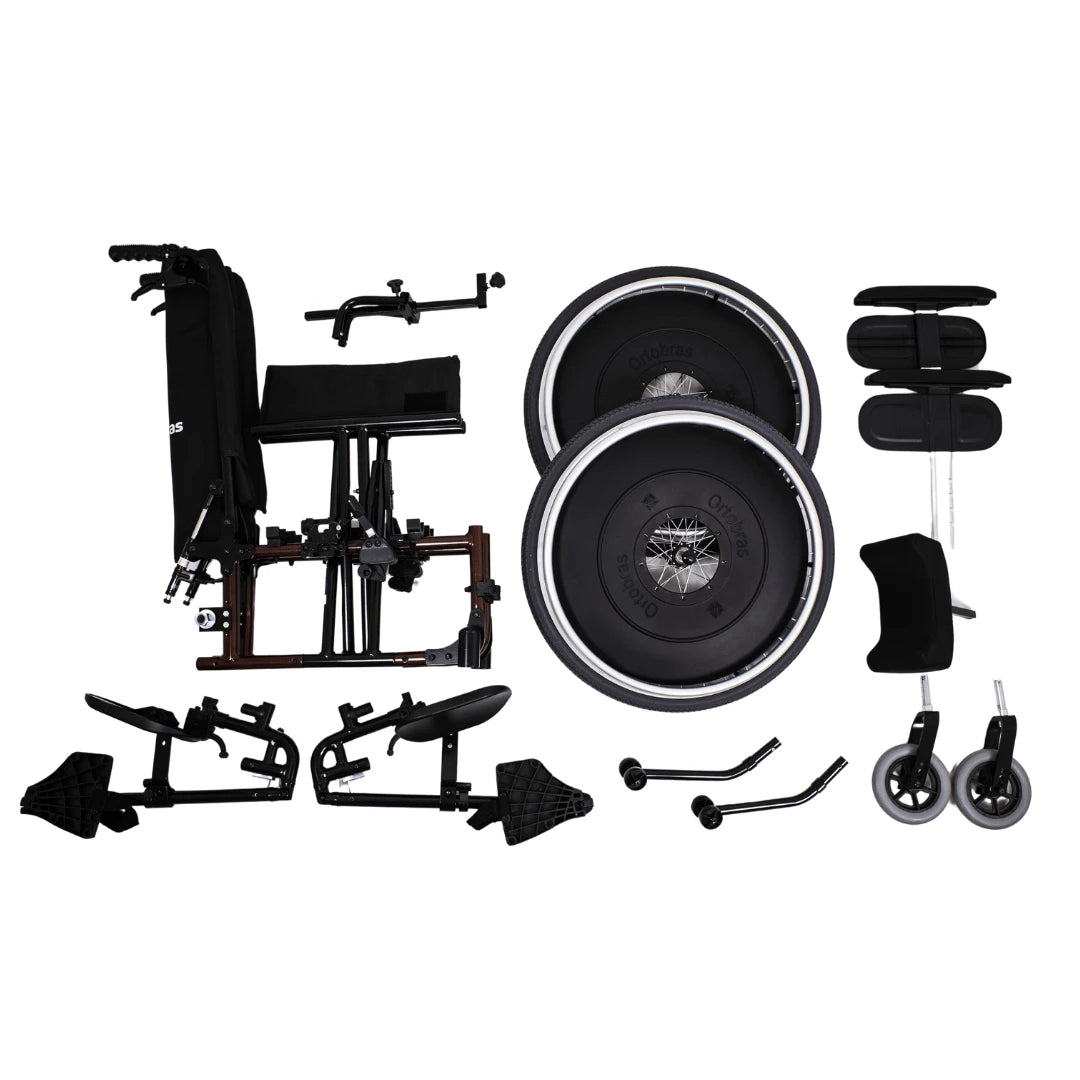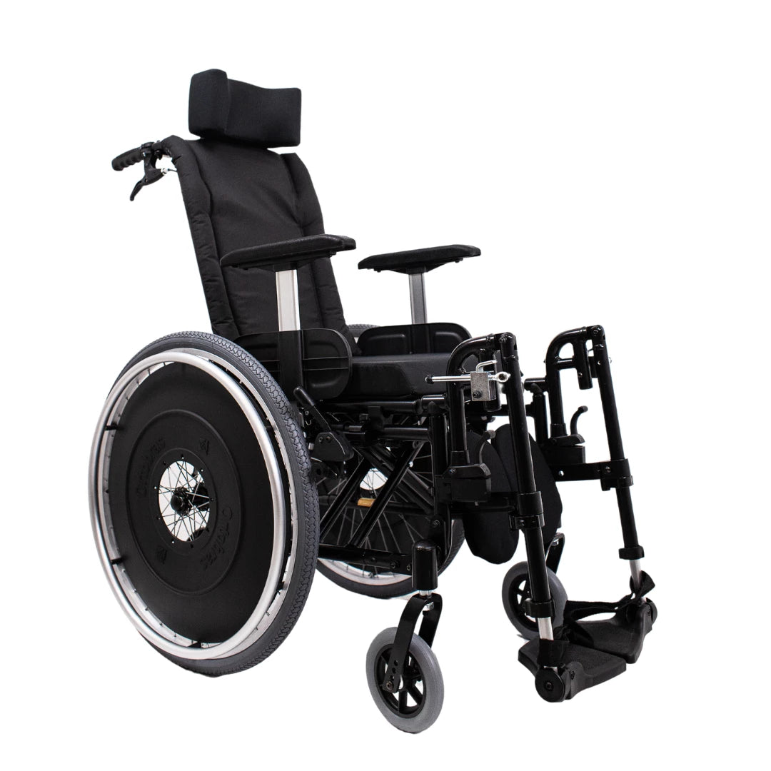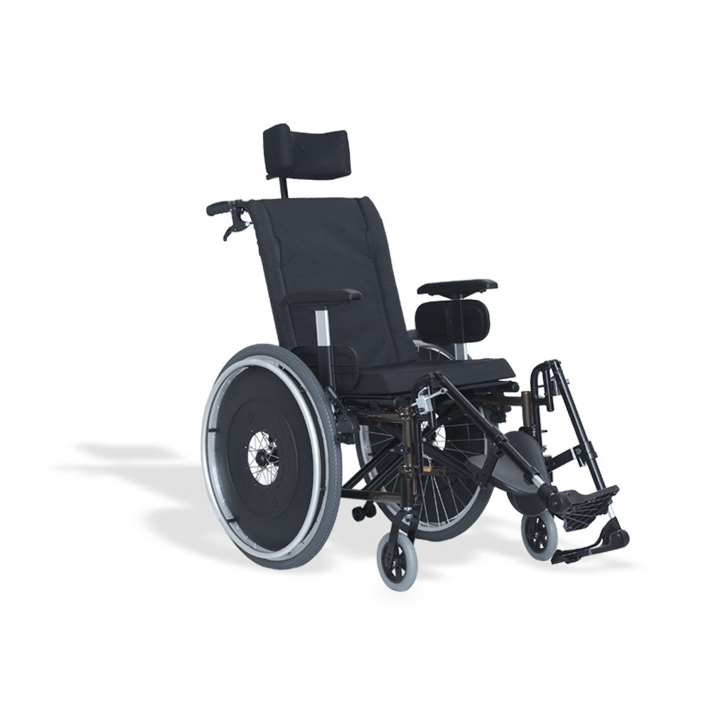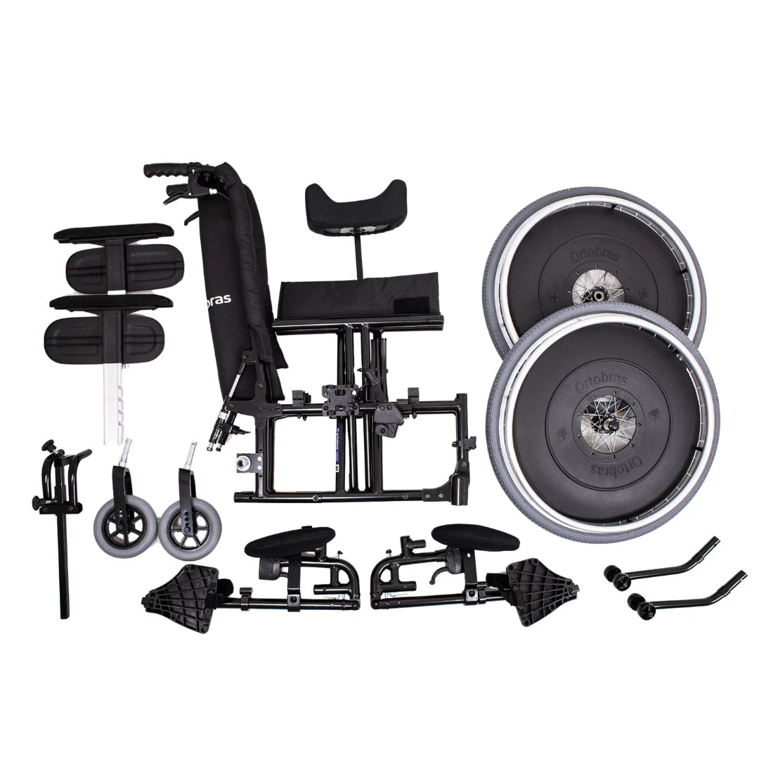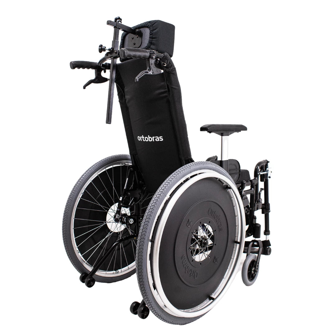 Estrutura em alumínio aeronáutico, sistema dobrável em “X” e conjunto de posicionamento com basculação do assento e encosto reclinável. Ideal para quem precisa de controle postural com conforto no dia a dia.