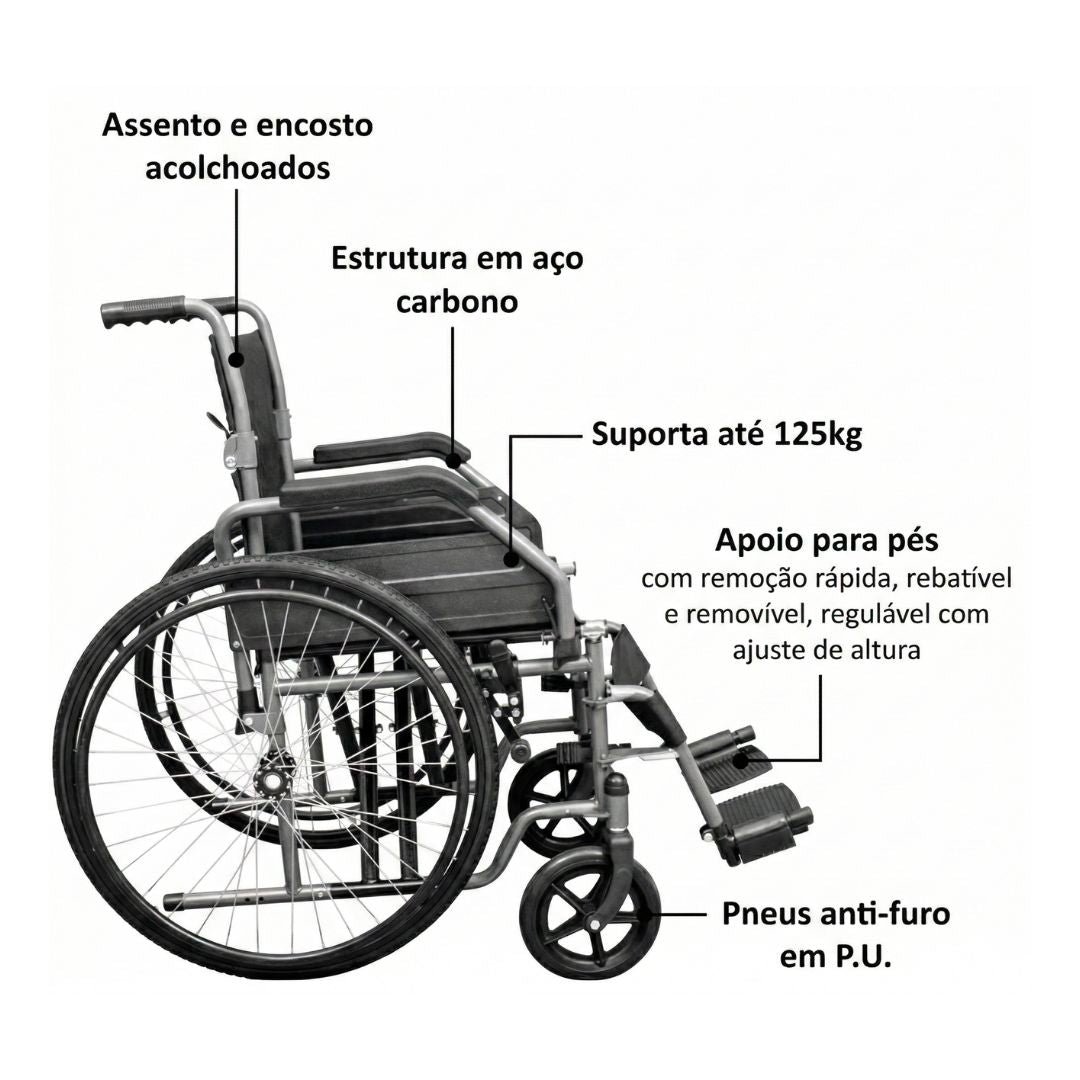 Estrutura em aço carbono com pintura epóxi, sistema dobrável em duplo “X”, encosto dobrável e design compacto (26 cm fechada). Rodas traseiras aro 24” com pneus antifuro em PU e dianteiras aro 8” maciças. Praticidade, conforto e segurança para o dia a dia.