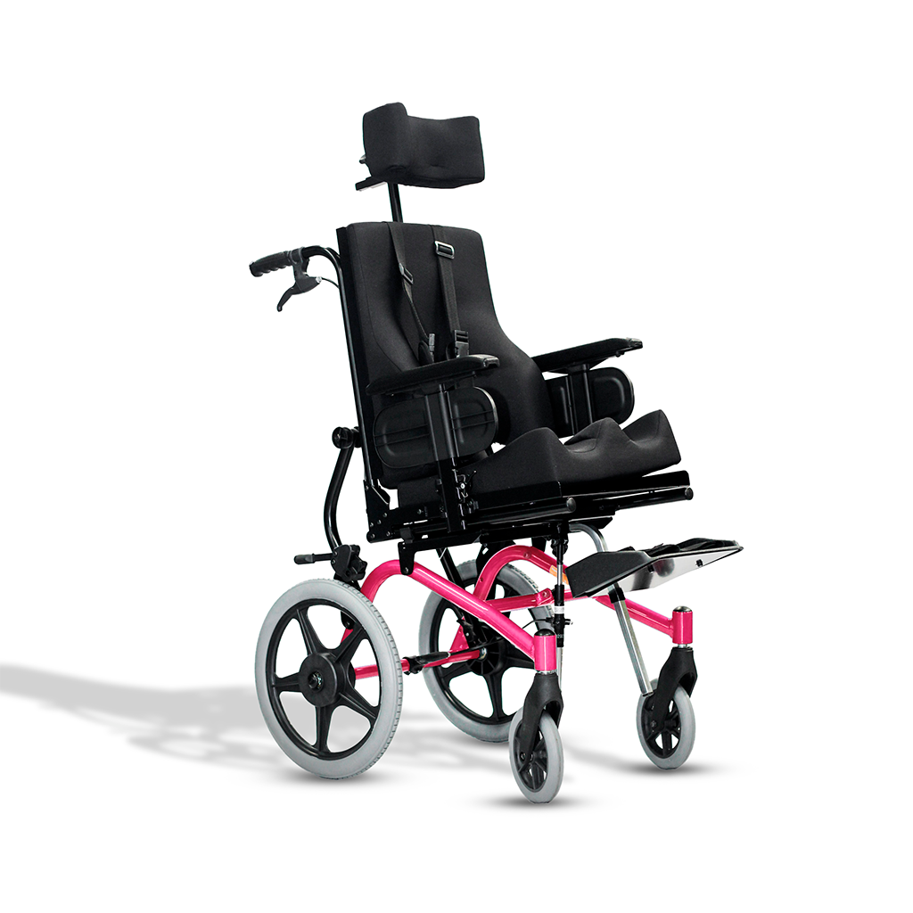 Cadeira postural infantil-juvenil com basculamento (tilt) e encosto reclinável, projetada para redistribuição de pressão, conforto e posicionamento postural em uso prolongado. Estrutura leve em alumínio e recursos que facilitam transporte e ajustes.