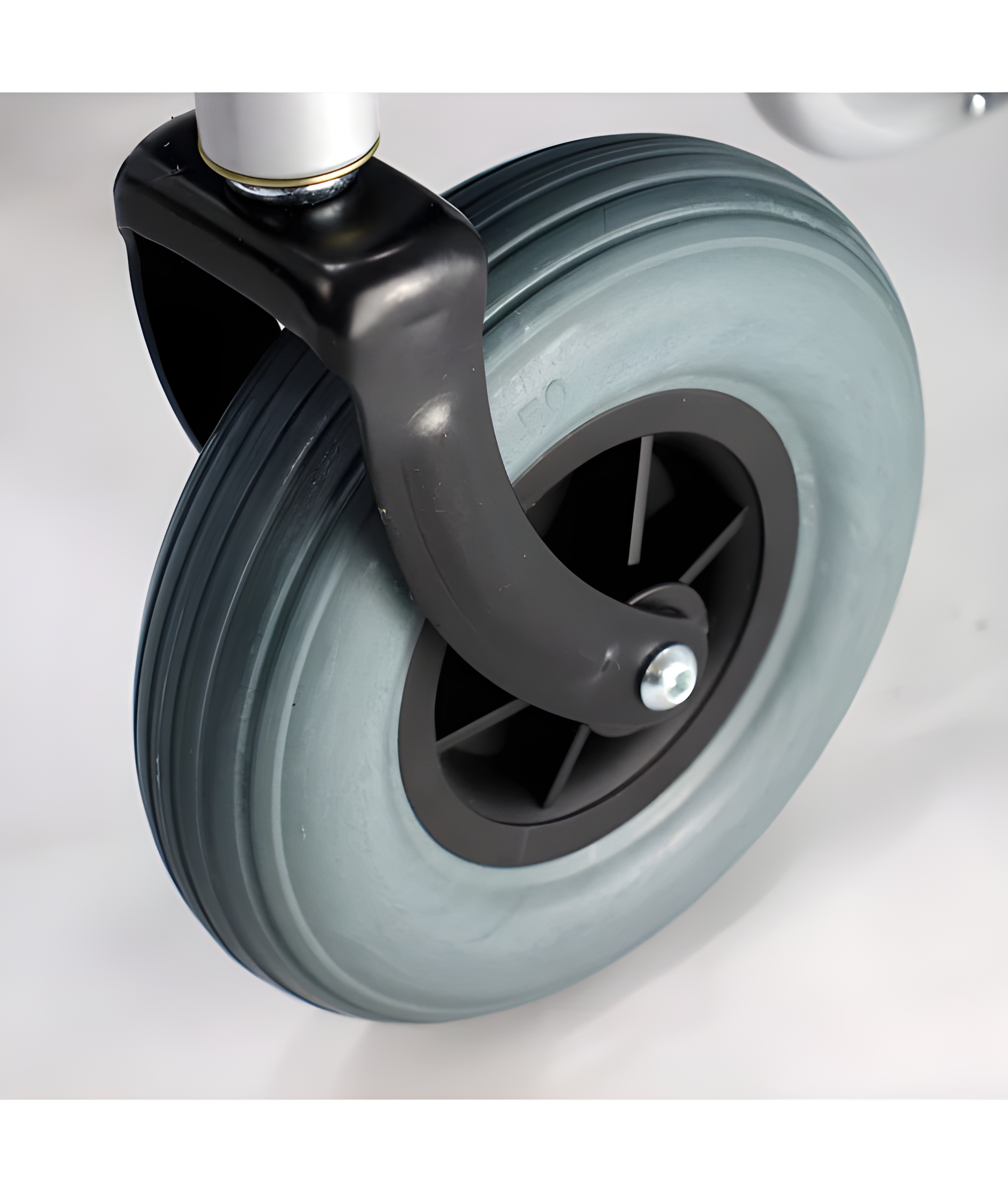 A Coyote Aço é uma cadeira de rodas com quadro de aço dobrável, apoios de braços escamoteáveis, pés ajustáveis e rodas que garantem robustez e praticidade para transferências e uso diário.