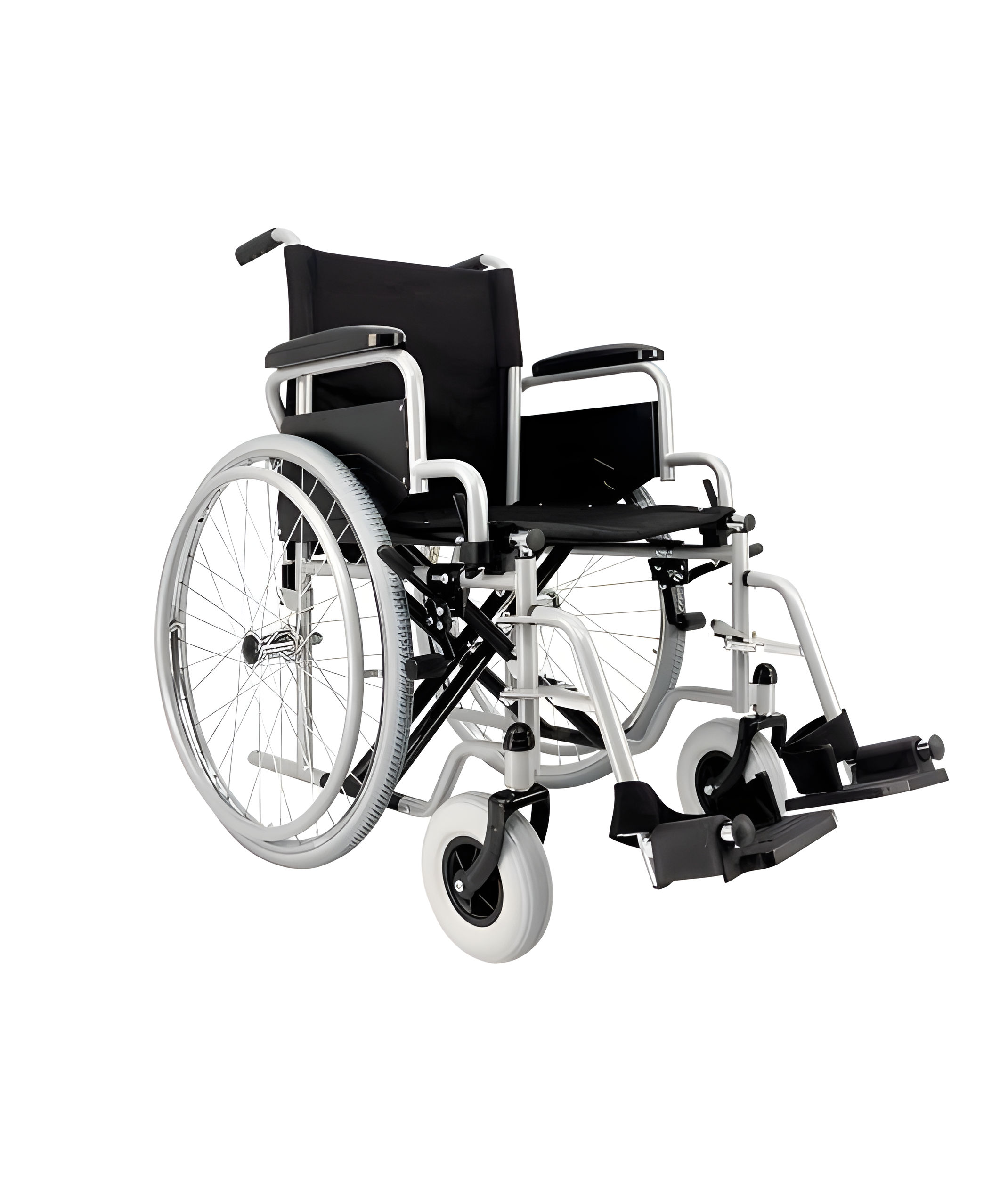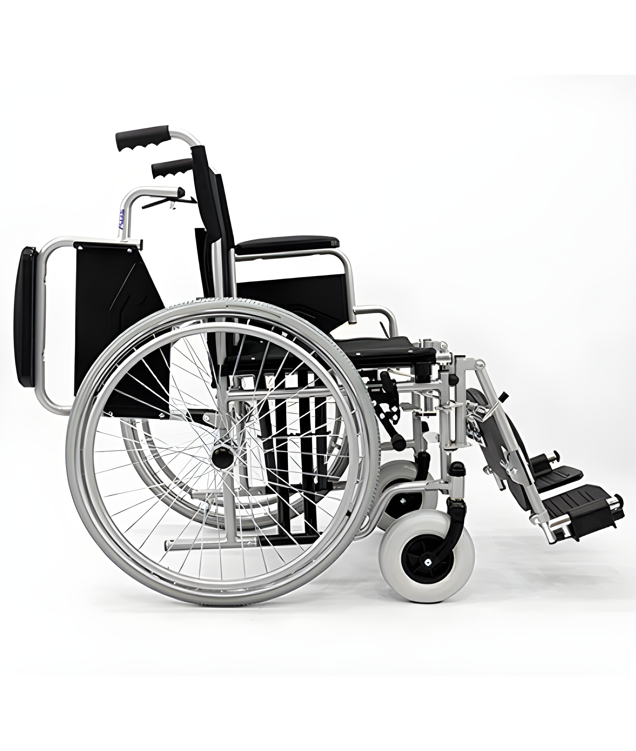 Cadeira de rodas dobrável com quadro em aço reforçado, apoios ajustáveis, ideal para hospitais, clínicas e uso diário com transportabilidade e durabilidade.