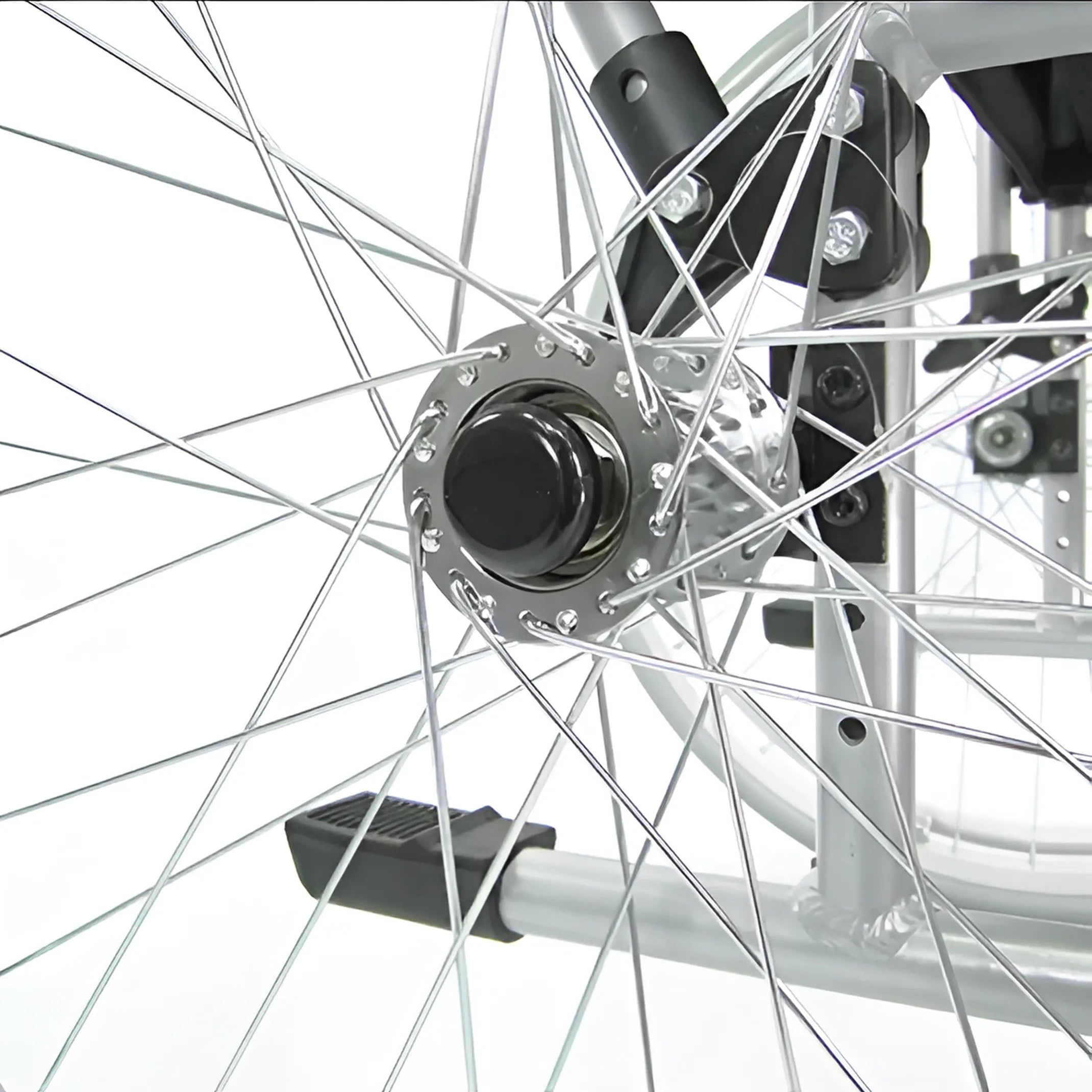 Praticidade para o cuidador: Eixos de engate rápido nas rodas e apoios rebatíveis facilitam a desmontagem.