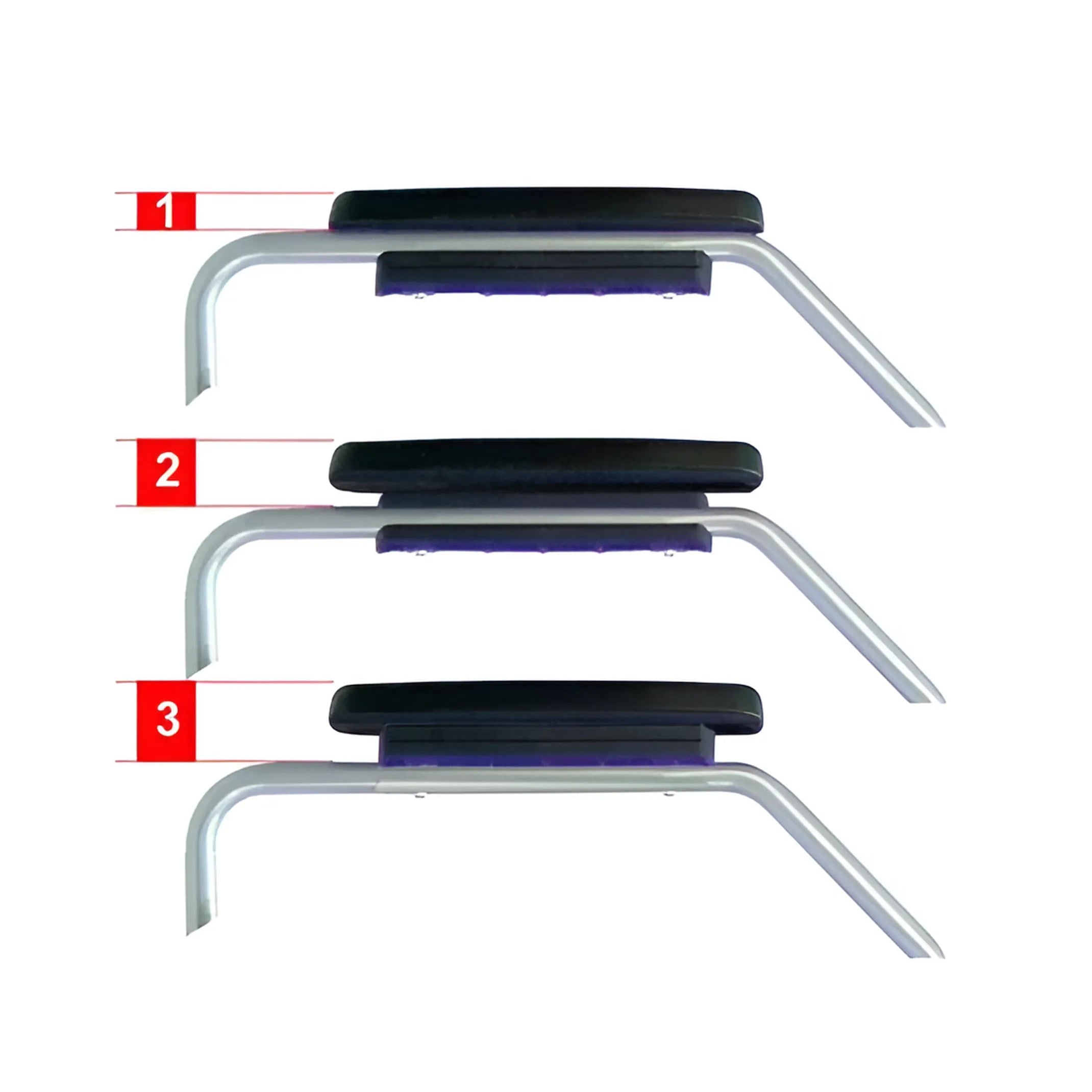 Apoios para os braços: Articulados e com ajuste de altura em 3 posições.
