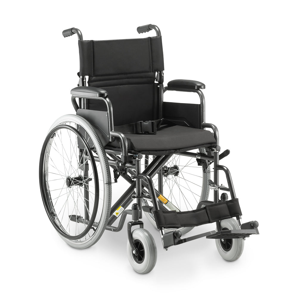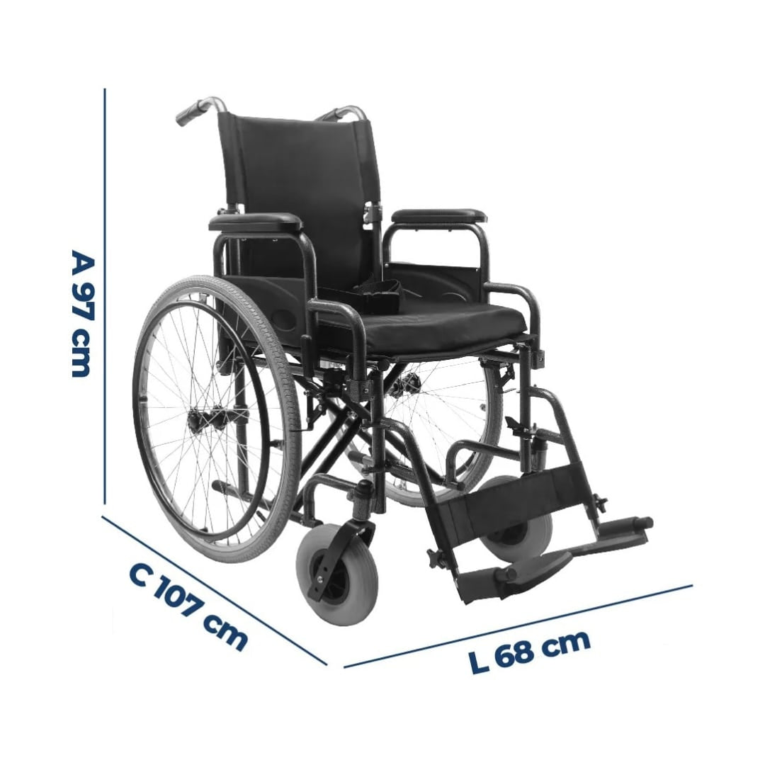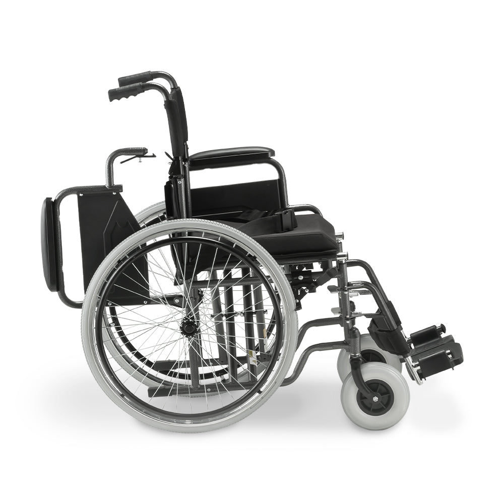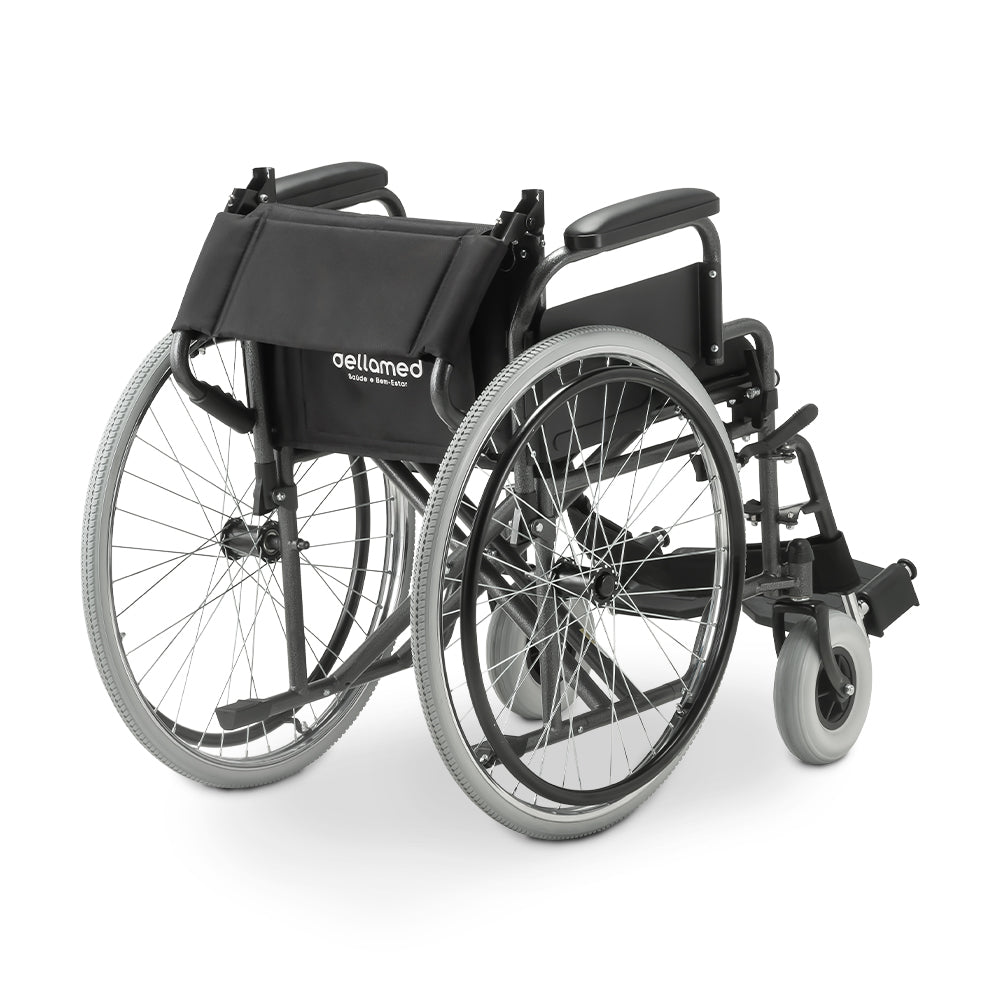 Estrutura tubular em aço carbono com pintura epóxi, fechamento em duplo “X” e capacidade para até 120 kg. Encosto rebatível, braços escamoteáveis e rodas traseiras 24” para impulsão suave no dia a dia.