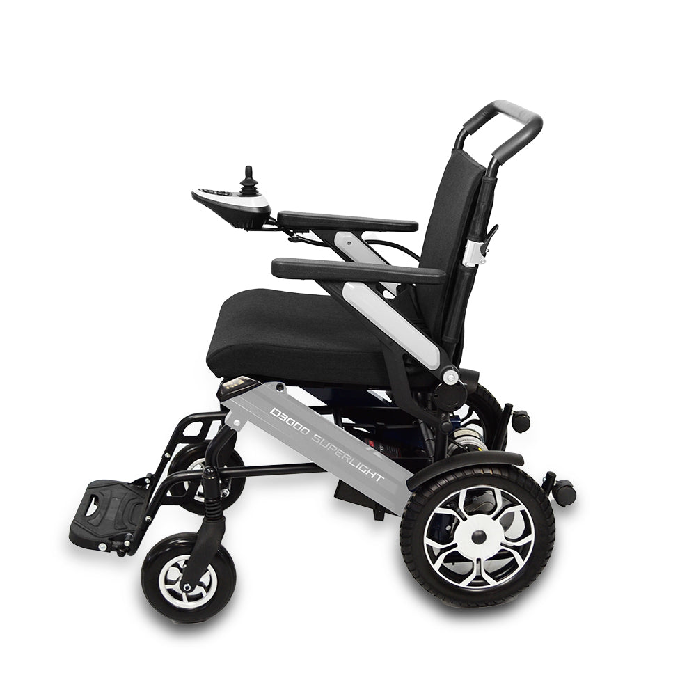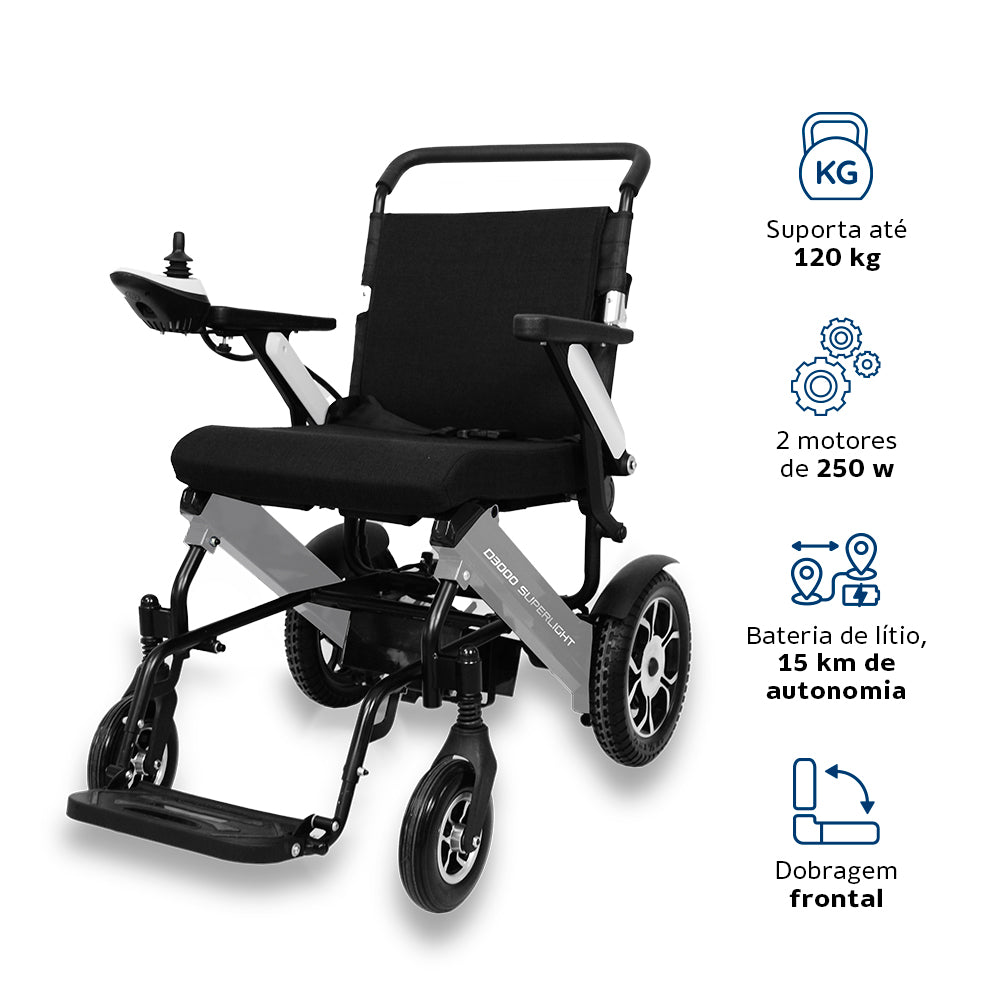 A D3000 Super Light é uma cadeira de rodas motorizada em alumínio, com dobragem frontal compacta, duas motorizações de 250 W e bateria de lítio 24 V removível, oferecendo autonomia, leveza e praticidade no uso diário e em viagens.