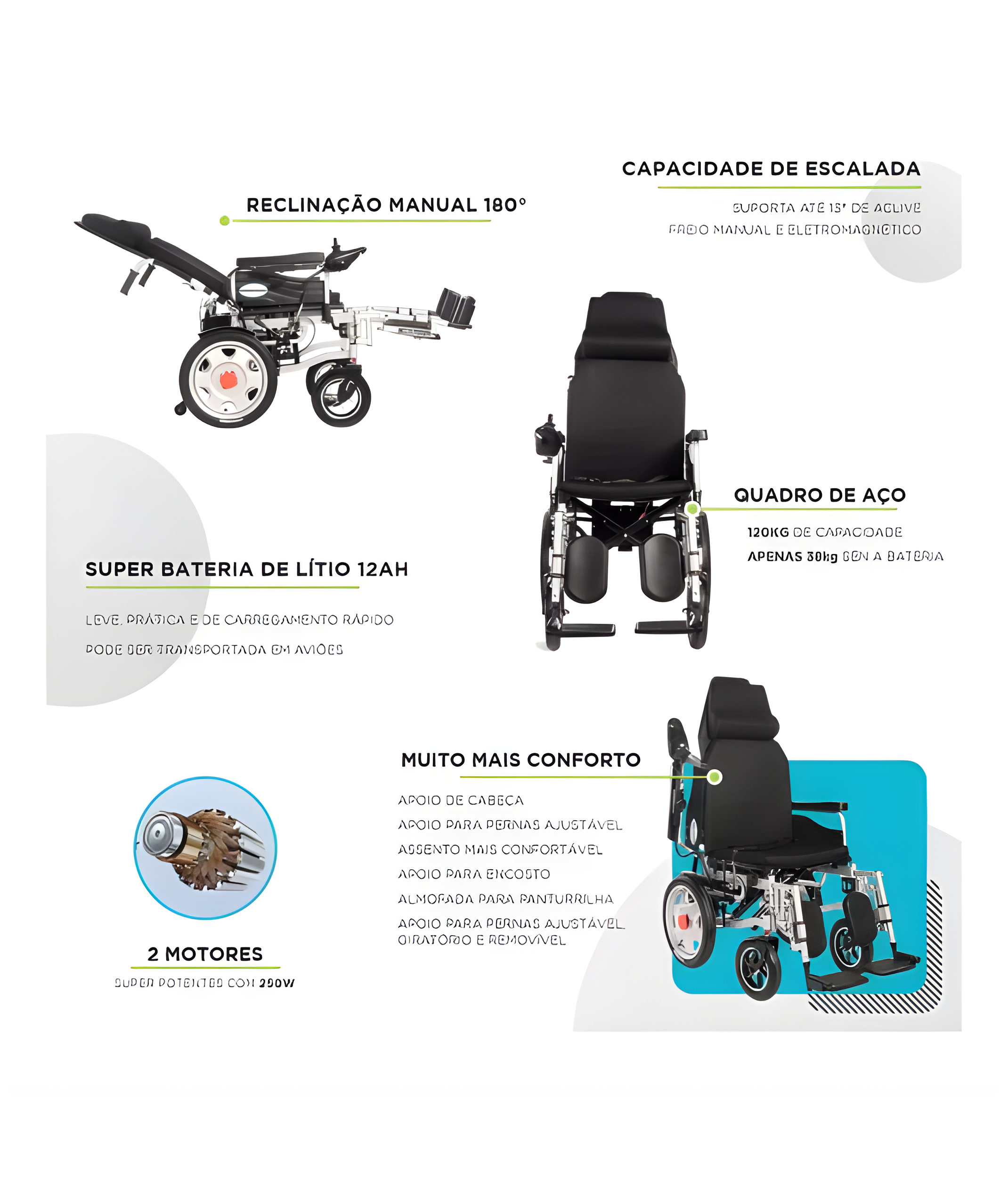 Estrutura em aço resistente, fechamento em X, dupla motorização e bateria de lítio. Mobilidade com conforto e segurança para o uso diário em ambientes internos e externos.