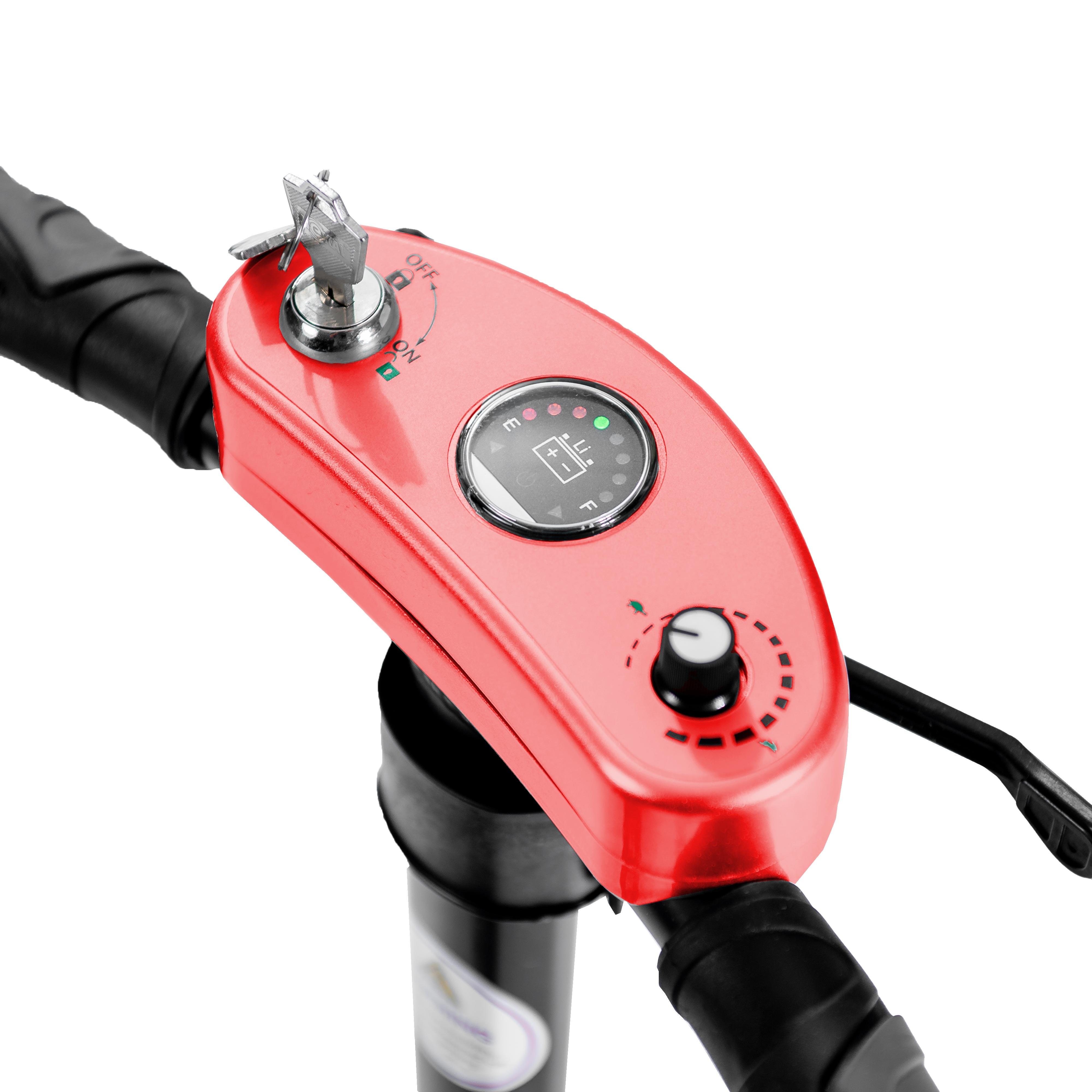 Ultracompacta, leve e dobrável. Velocidade máxima de 6 km/h, raio de giro de 70 cm e peso total de apenas 23 kg (com bateria). Mobilidade prática e segura para uso interno e externo.