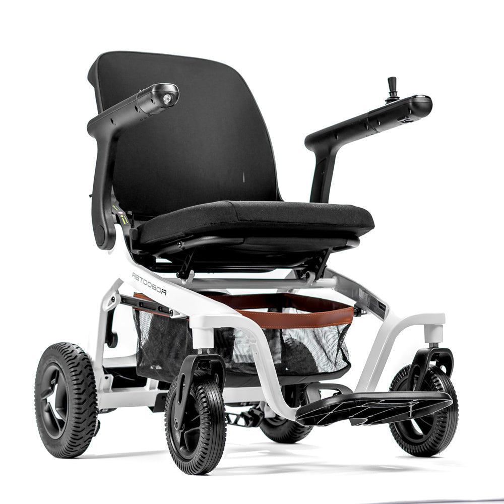 A Robooter Power Lite é uma cadeira de rodas motorizada dobrável e leve (aprox. 27 kg com bateria), com dois motores de 250 W, rodas traseiras 10" e dianteiras 8". Traz joystick LCD, opção de controle por app, mochila integrada e cesto sob assento, entregando praticidade e autonomia em ambientes internos e externos.