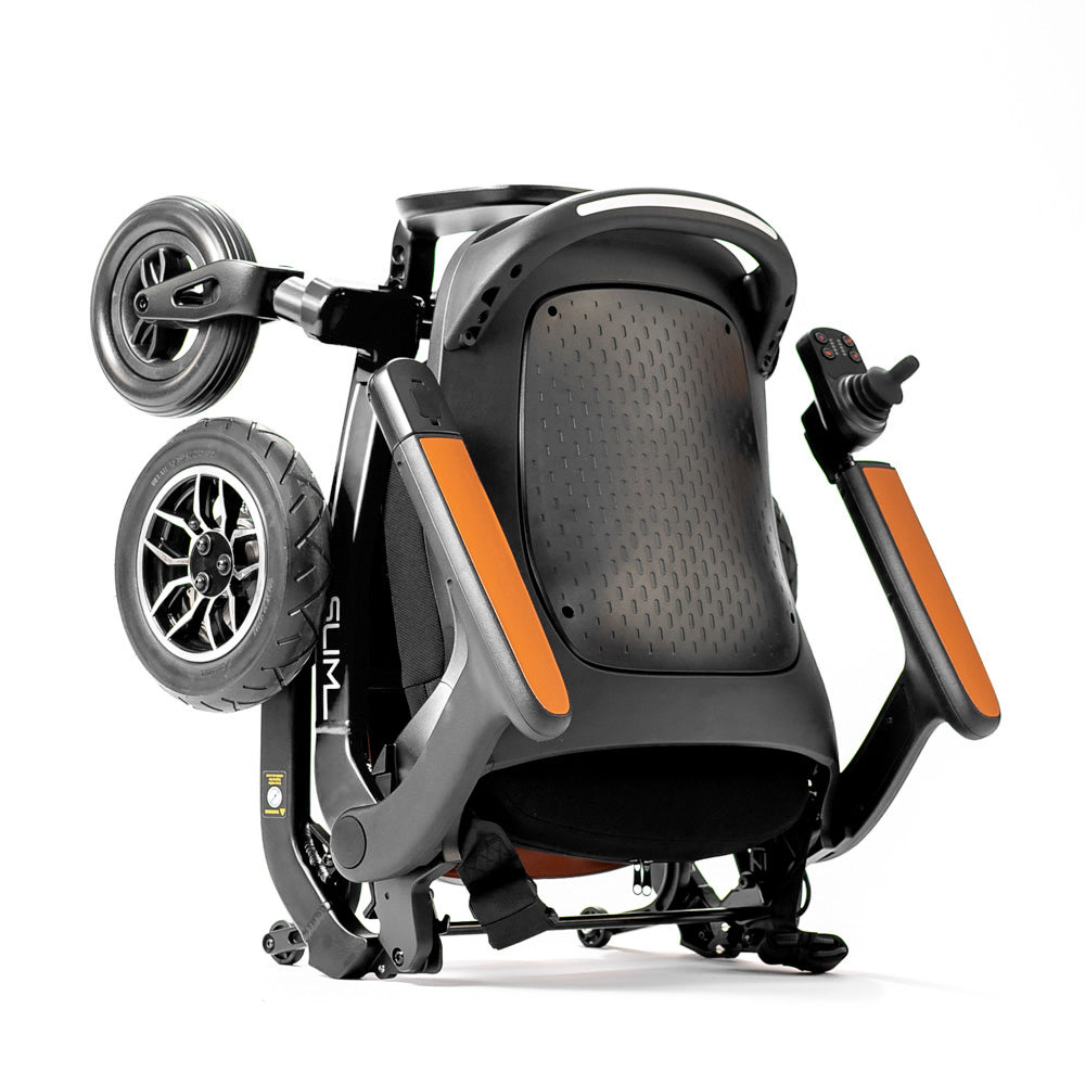 A Slim é uma cadeira de rodas motorizada compacta e dobrável, com estrutura em alumínio, bateria de lítio 24 V e controle por joystick, projetada para oferecer autonomia, praticidade e segurança no cotidiano.