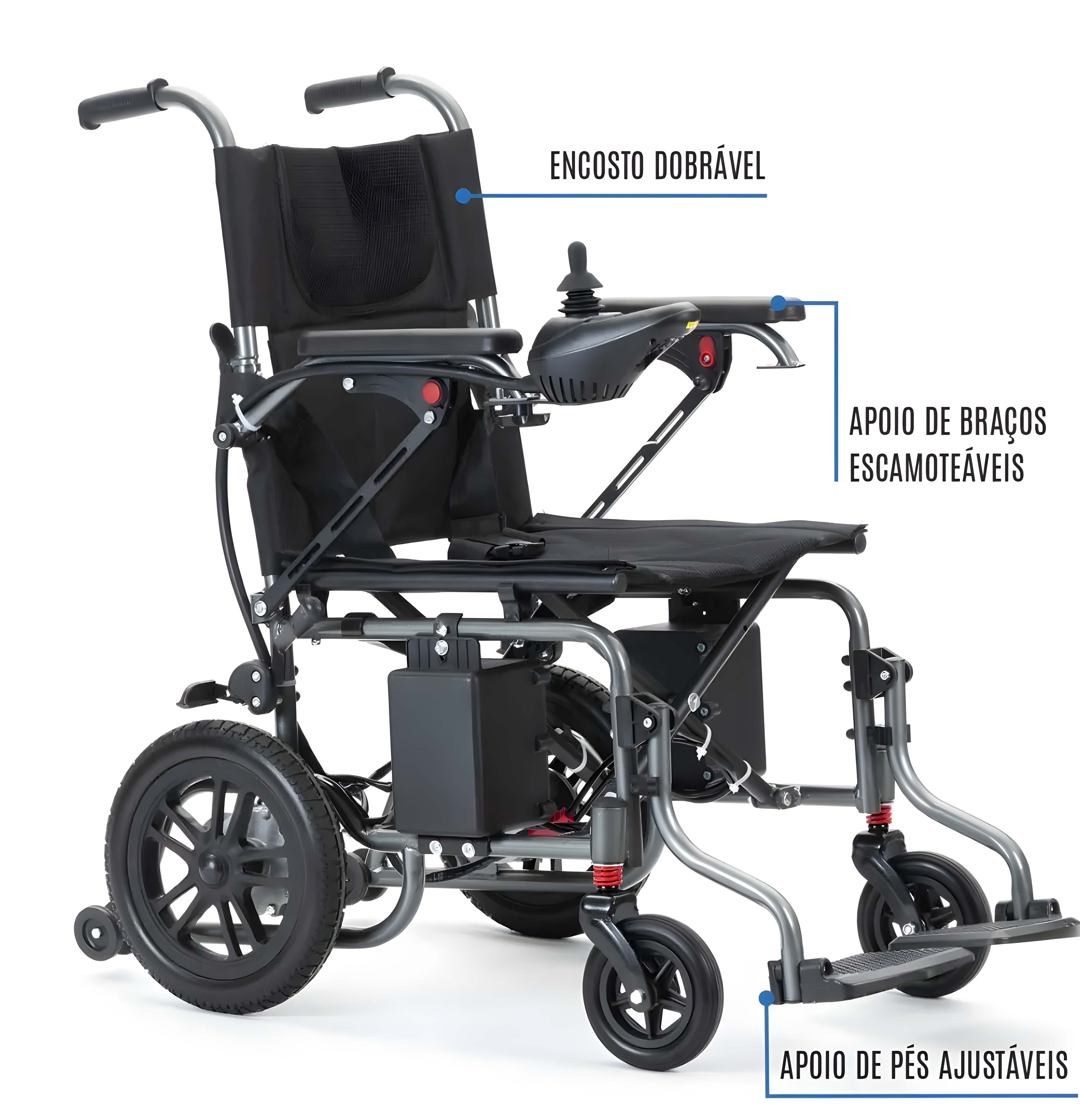 Estrutura dobrável, leve e prática, com joystick intuitivo e autonomia de até 20 km para mobilidade confortável e segura em ambientes internos e externos.