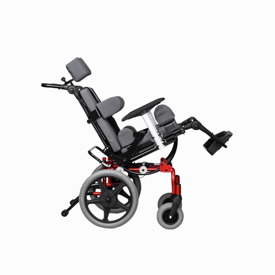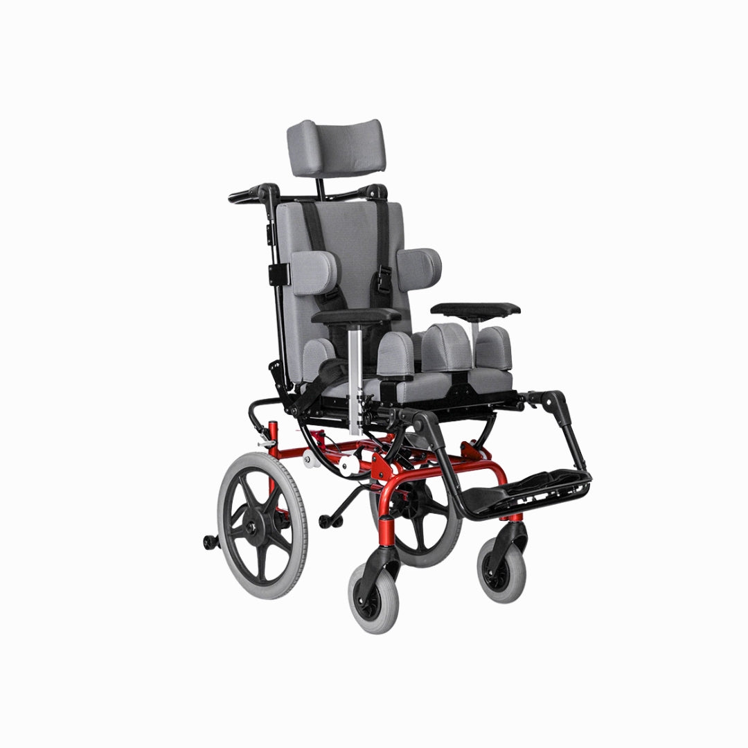 Cadeira postural monobloco dobrável com tilt multiposicional e encosto reclinável em 3 posições. Estrutura em alumínio, eixos desmontáveis e opções de contenções ajustáveis para adequação postural segura.
