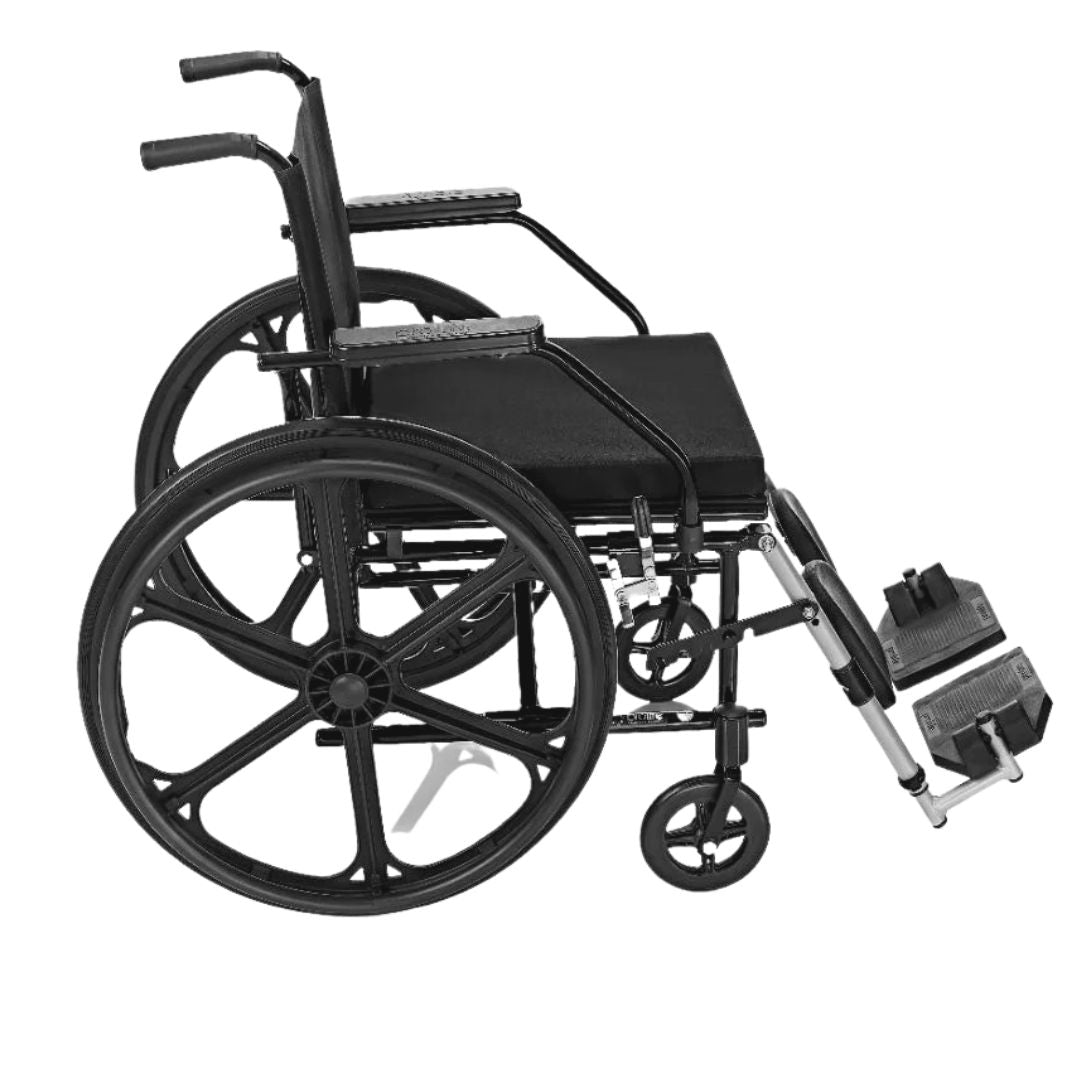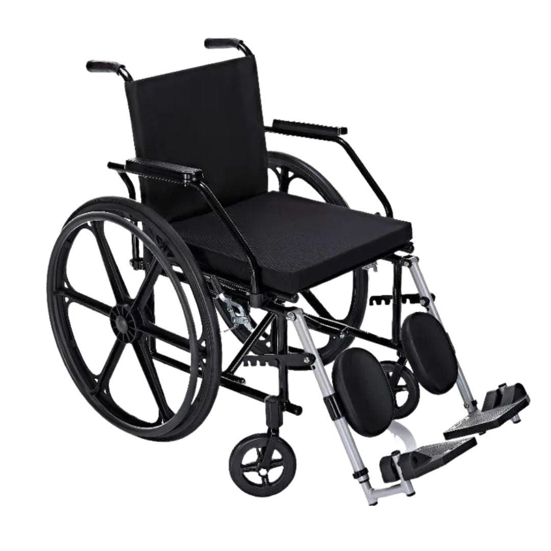 Estrutura em aço carbono dobrável em “X”, pneus maciços (aro 24" traseiro / 6" dianteiro), apoios de pernas eleváveis com regulagem e braços escamoteáveis. Conforto e praticidade para o dia a dia.